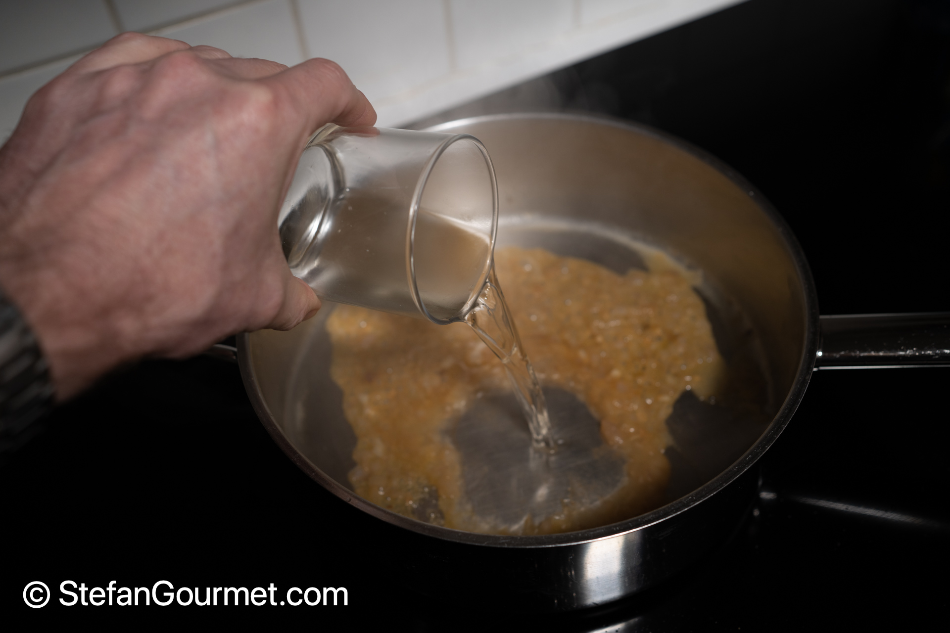 When the cognac has evaporated, deglaze with 60 ml of white wine.