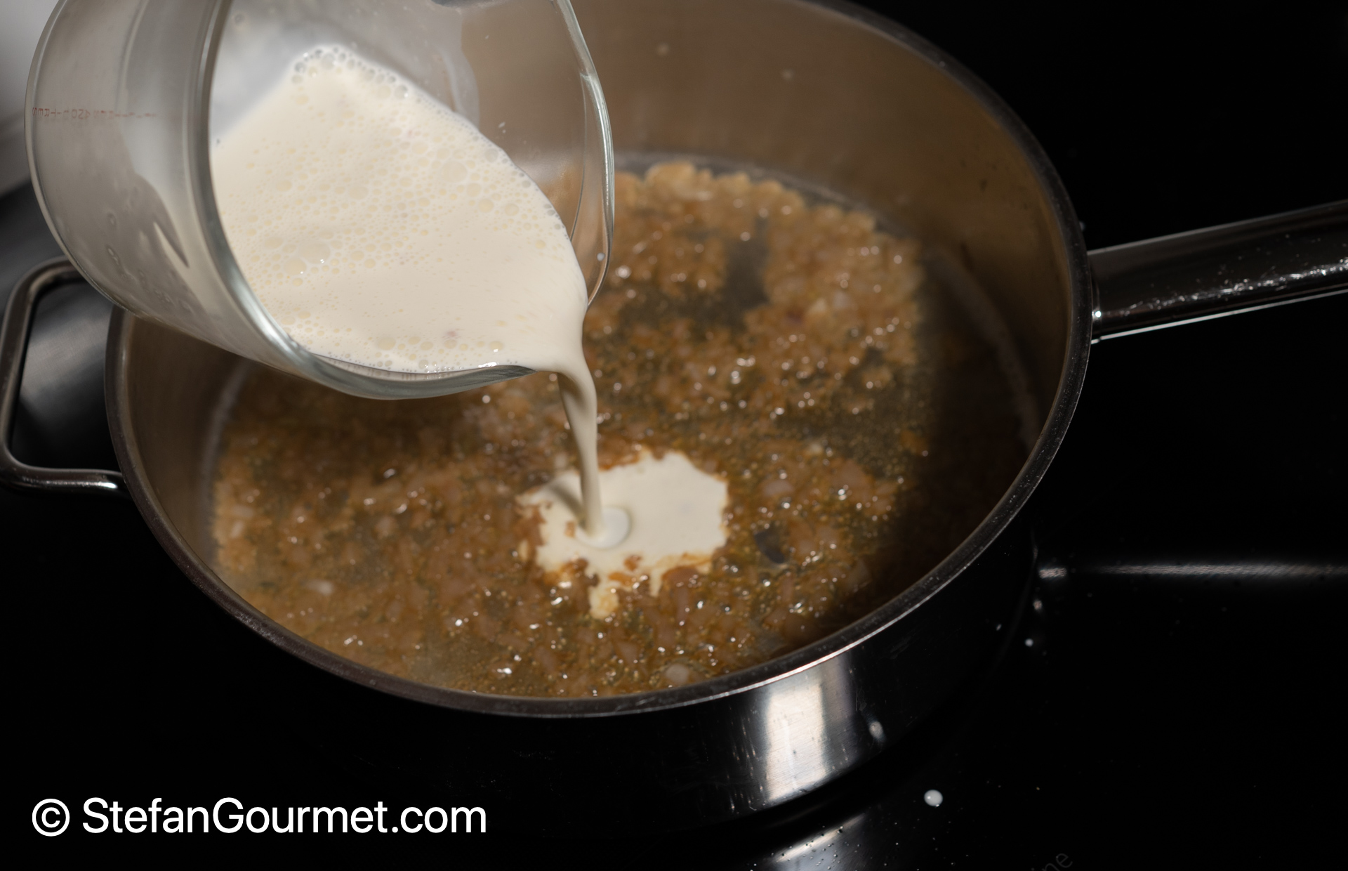 Add the mustard-infused cream to the shallots as soon as most of the wine has evaporated.