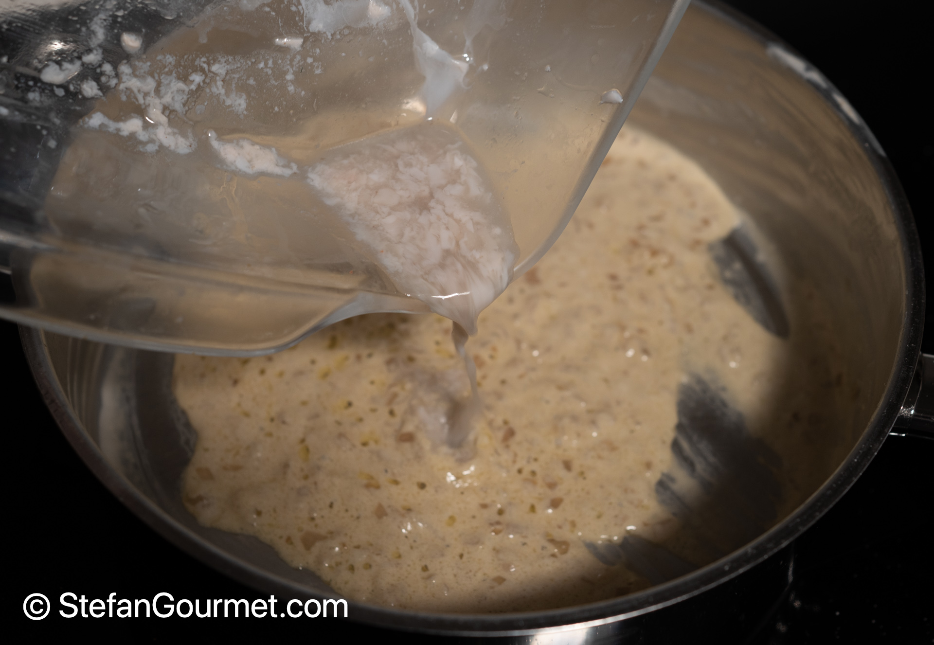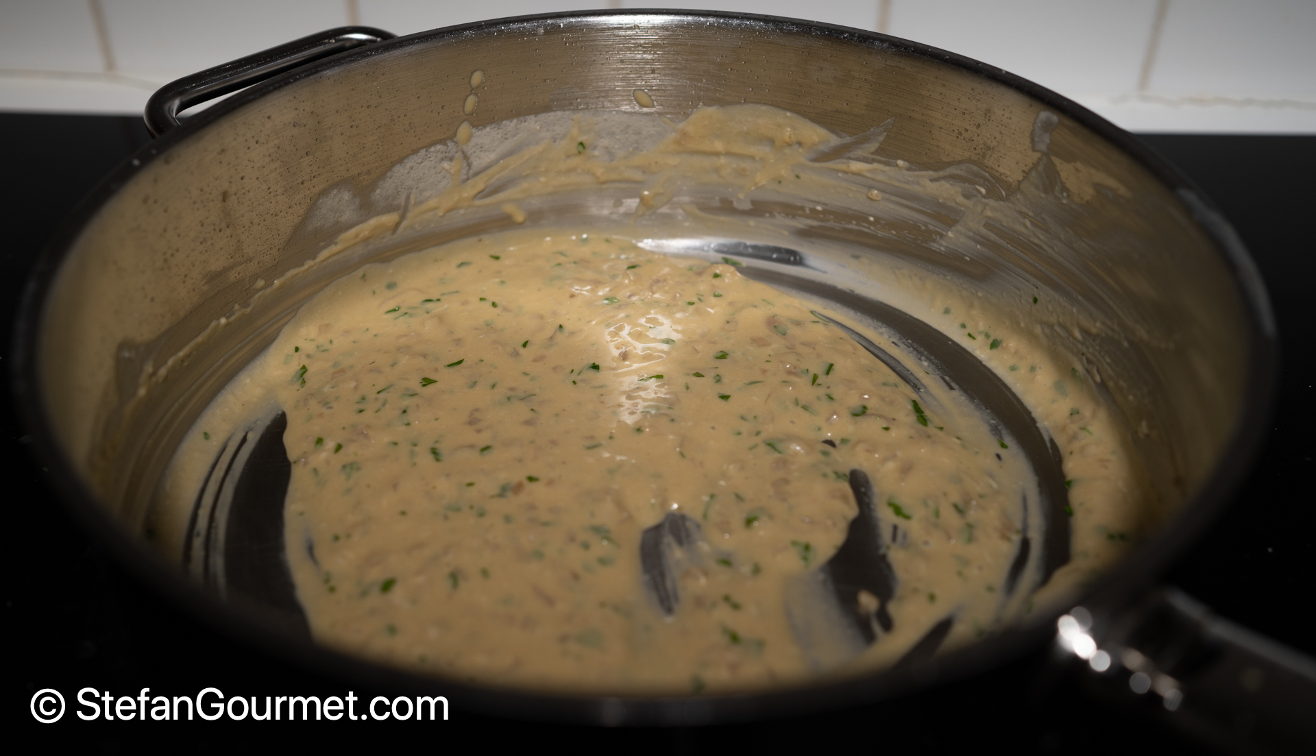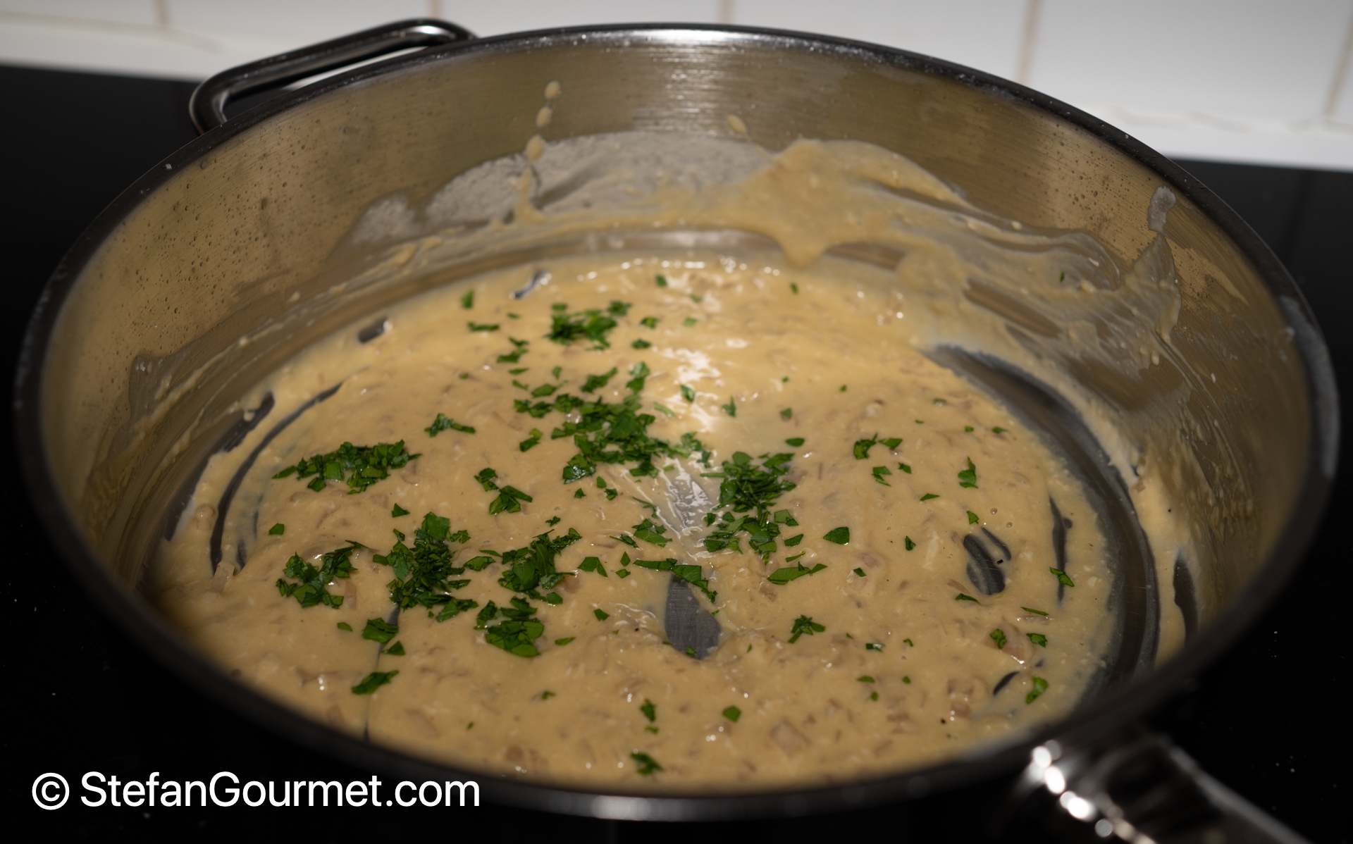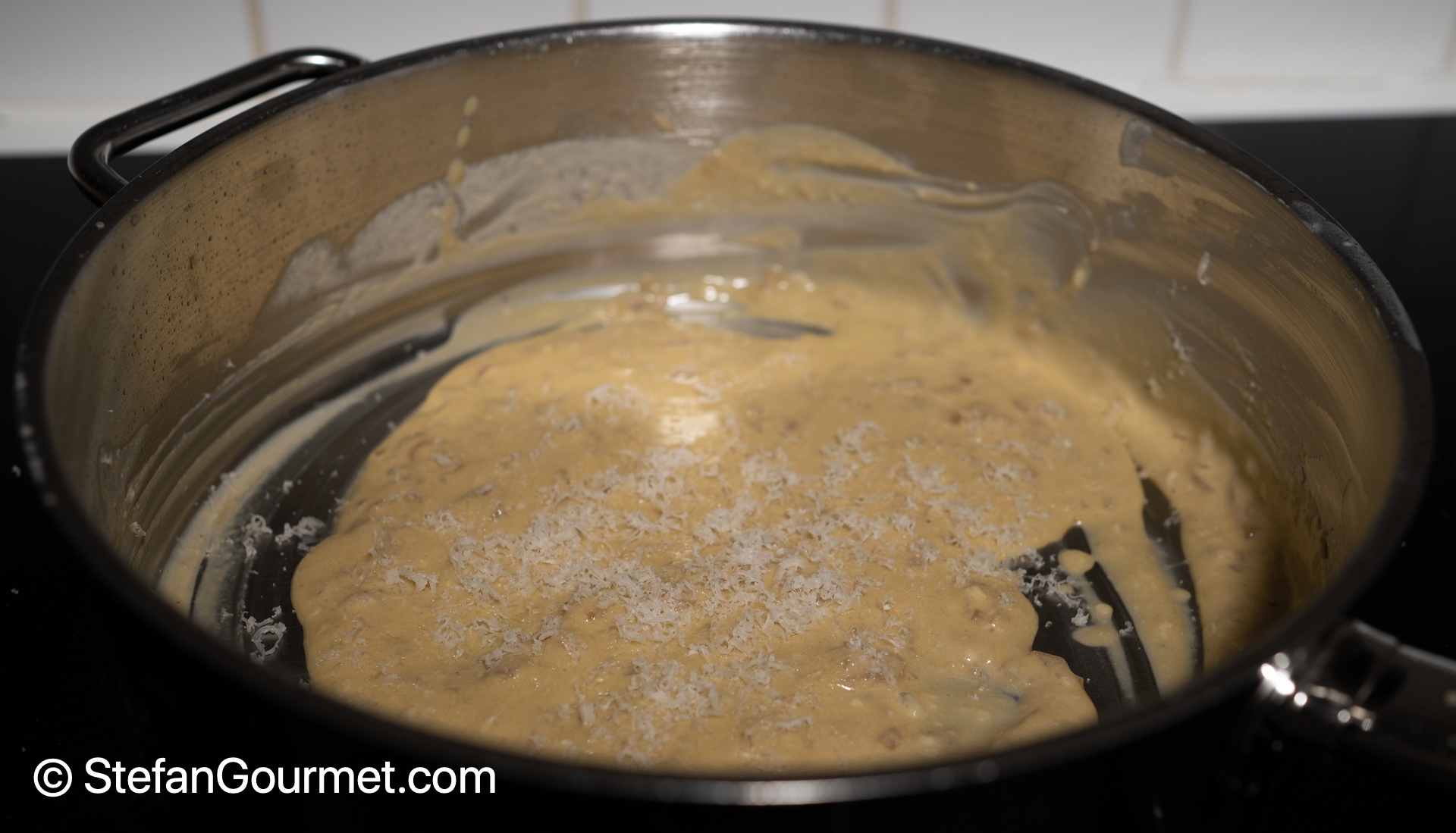 Allow the cream to reduce over medium heat, stirring regularly. When the sauce has thickened somewhat, season to taste with salt and freshly ground white pepper.
