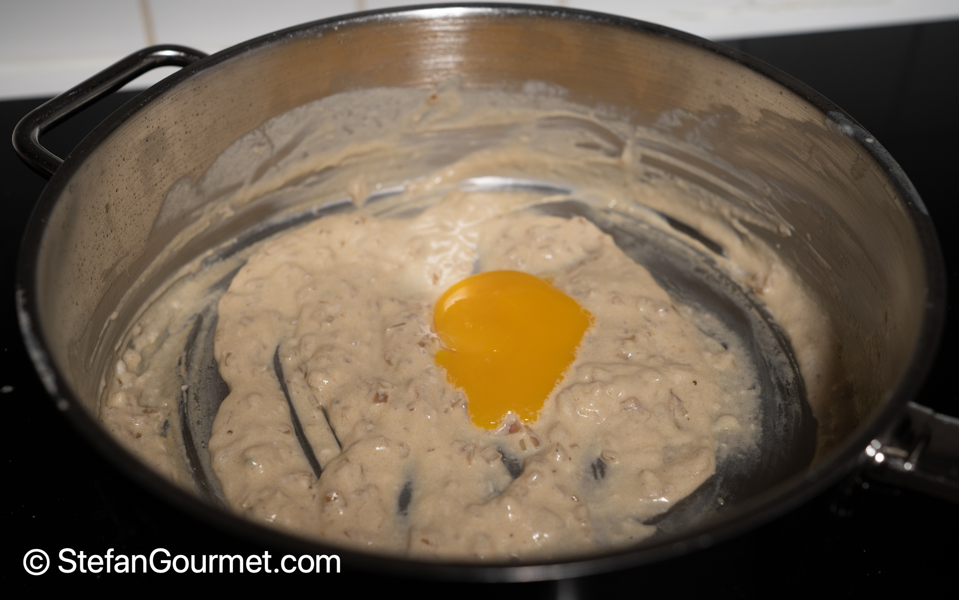 Turn off the heat, and add an egg yolk. Stir to incorporate the egg yolk. This will thicken the sauce.