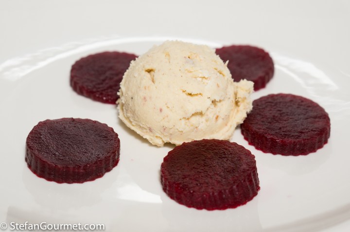 Eel ice cream with beets. The creamy and smoky eel ice cream works very well with the earthy and crisp beets.