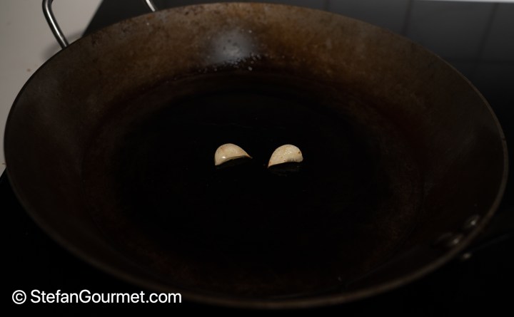 Peel the garlic clove and cut in 2 or 3 slices. Put the large frying pan with the rendered duck fat over medium heat, and cook the garlic until golden on both sides. Then discard the garlic.