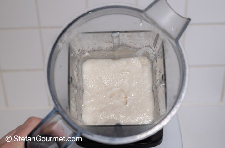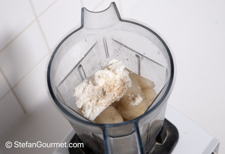 When the sunchokes are cooked, put them in a blender together with the ricotta. Season with salt and freshly ground white pepper.