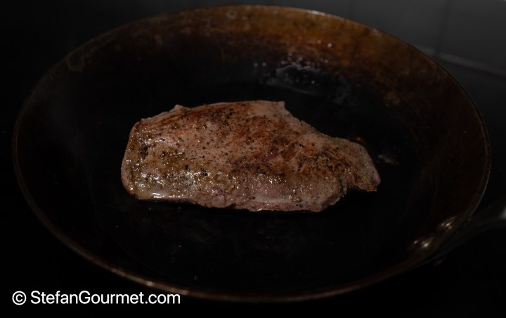 Sear it briefly (30 seconds per side) over very high heat in the small frying pan with rendered duck fat.