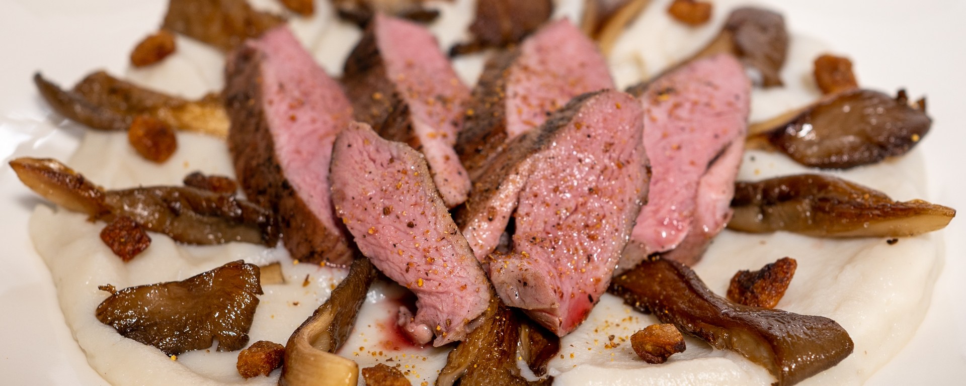 Place a circle of sunchoke puree on each preheated plate. Arrange the mushrooms, duck meat, and crackling on top. Season the duck some more with the mixture of salt and five spice.