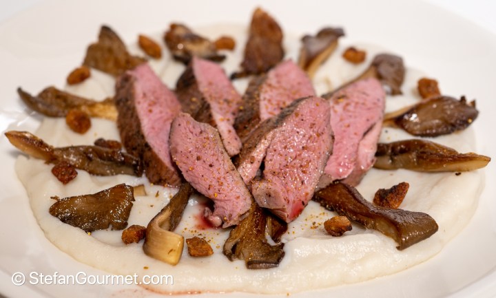 Sunchokes are also called jerusalem artichokes, because their flavor is similar to artichokes. Unfortunately, that also means that it can be difficult to find a wine pairing. If memory serves me right, Anja served this with a red from Veneto from dried grapes, that worked very well. A pinot noir could also work, if it is not too dry. Instead of red, an oaked white could also work.