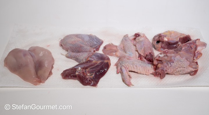 I butchered the roosters into breast fillet, legs, and other parts. Do you notice what a dark color the leg meat has? This is because these roosters have been allowed to run around the backyard.