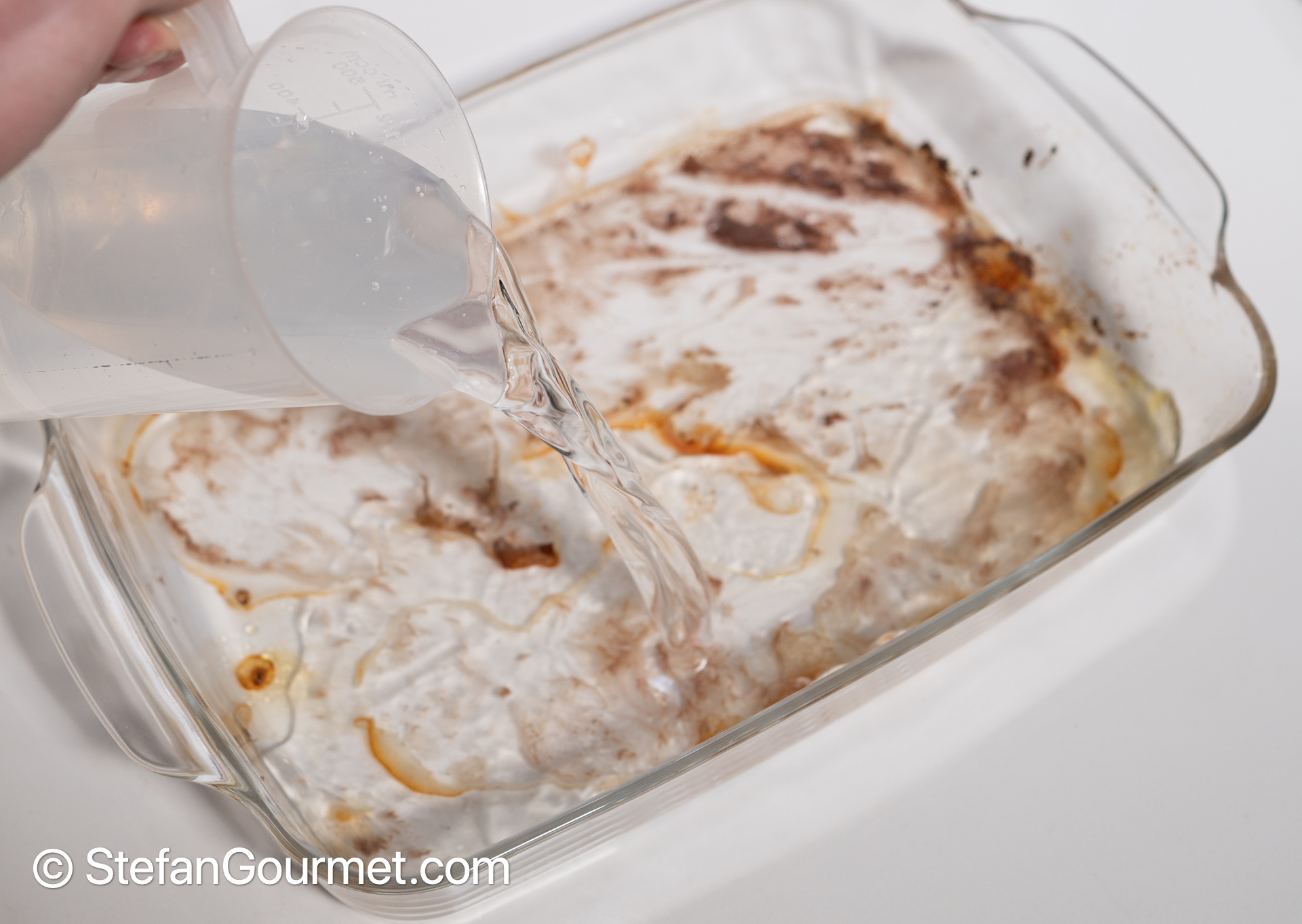 Transfer the browned carcass pieces to a stockpot or pressure cooker, and deglaze the oven dish with water.