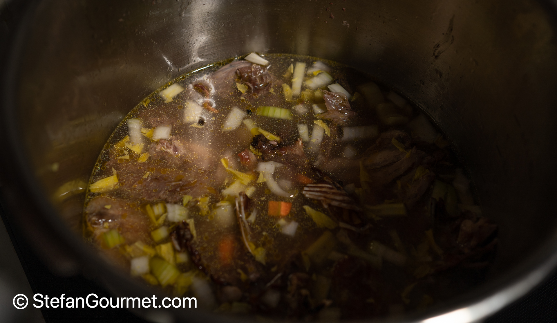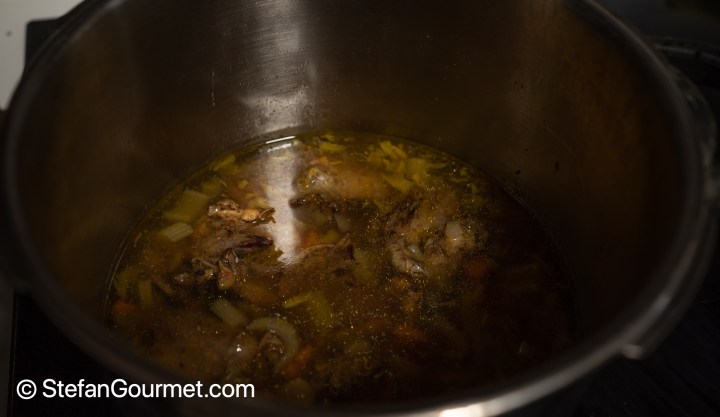Pour that water into the stockpot or pressure cooker with the carcasses. Add chopped celery, onion, and carrot, and barely cover with water.