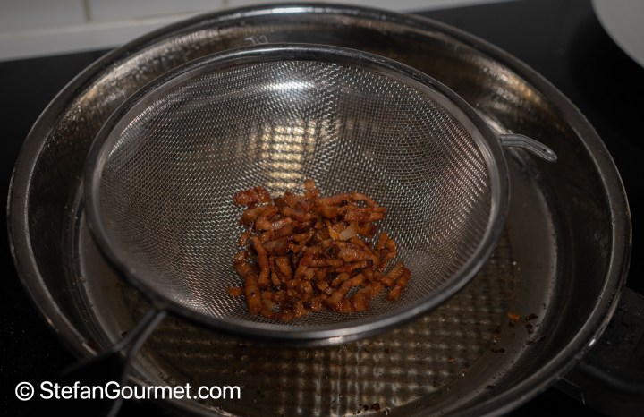 …then use a sieve to remove the pancetta, while keeping the fat in the pan. Reserve the pancetta.