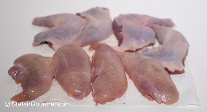 Season the breast fillets and legs with salt and freshly ground black pepper.