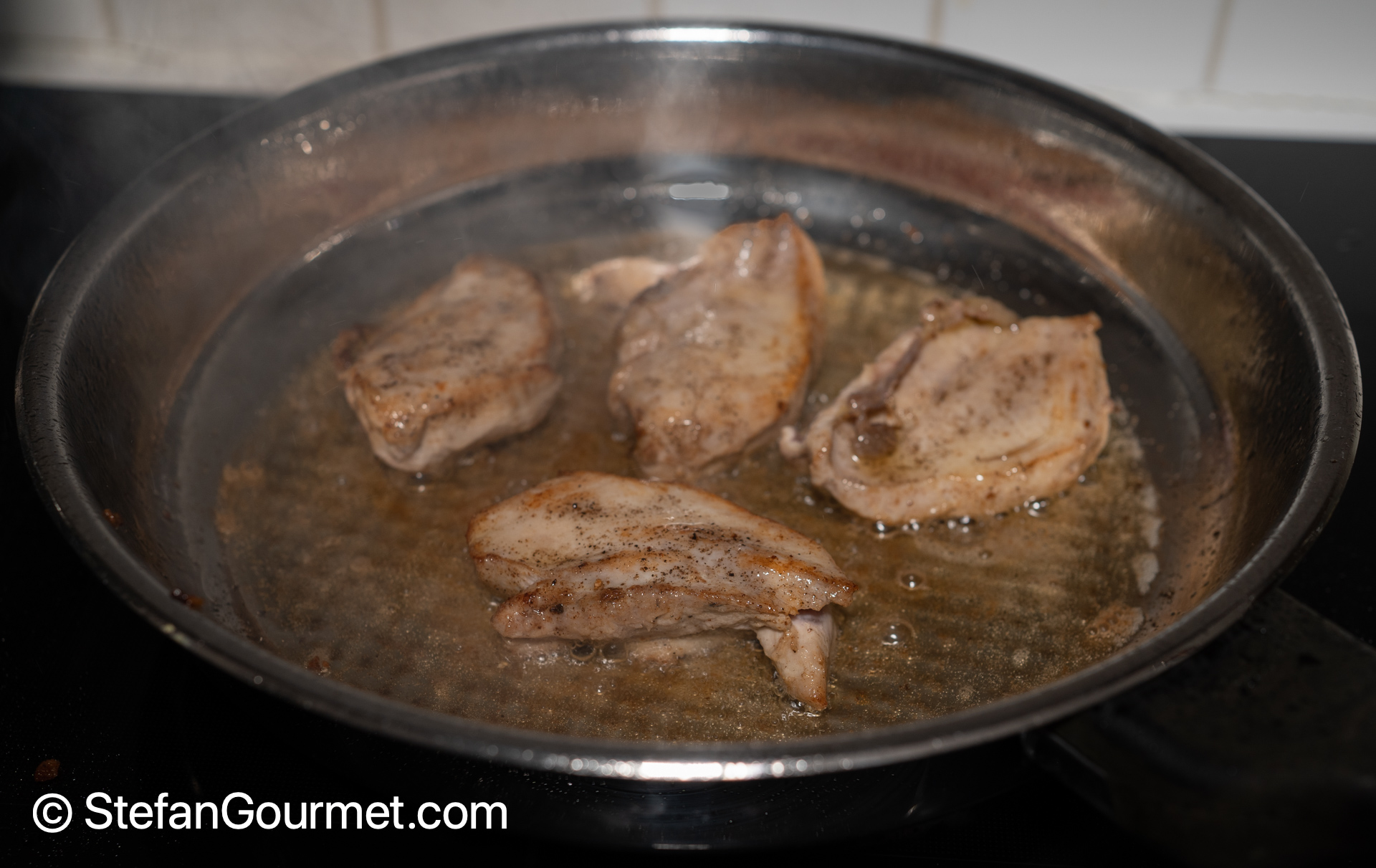 Brown the breast fillets over high heat in the same pan, about 1 minute per side. Then take out the breast fillets and allow to cool.