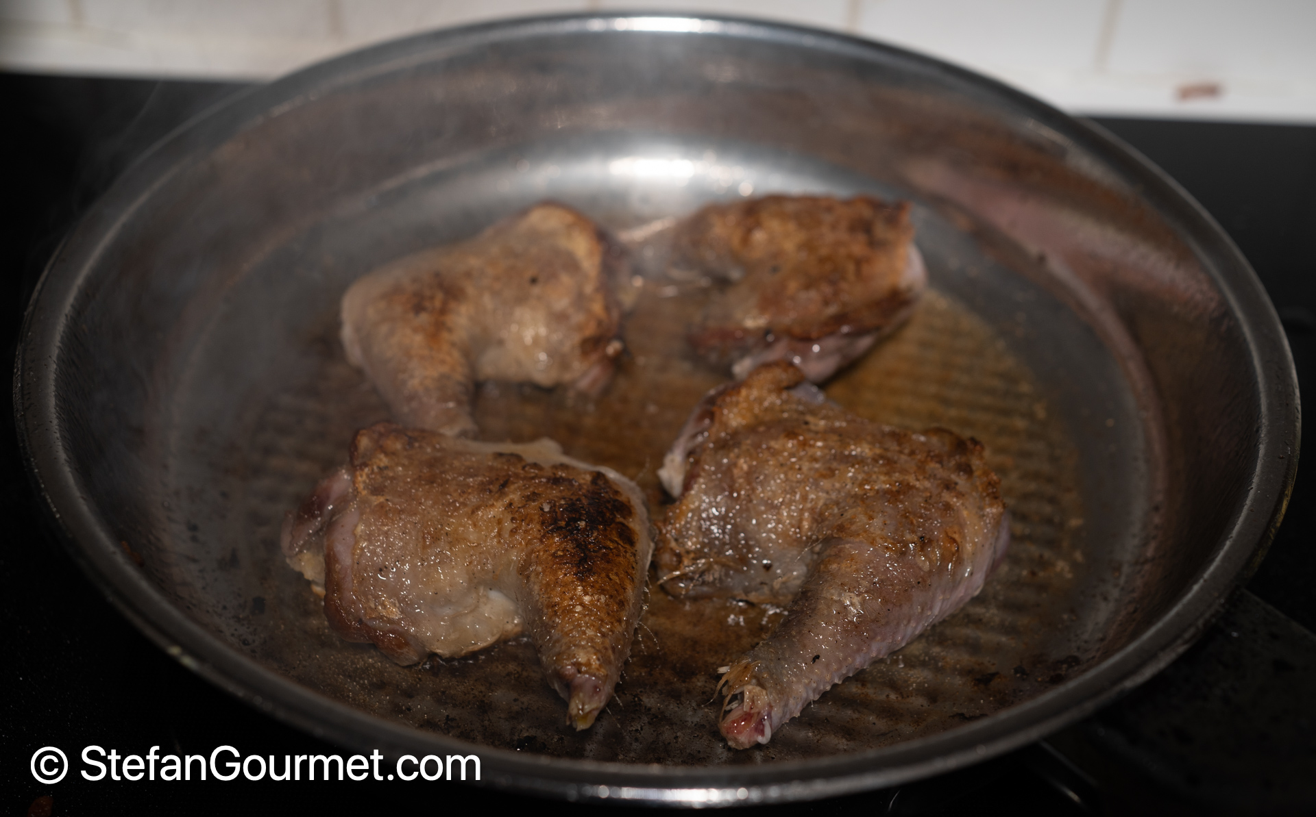 Brown the legs in the same pan, about 1 minute per side, until nicely browned. Then take out the legs and allow to cool.