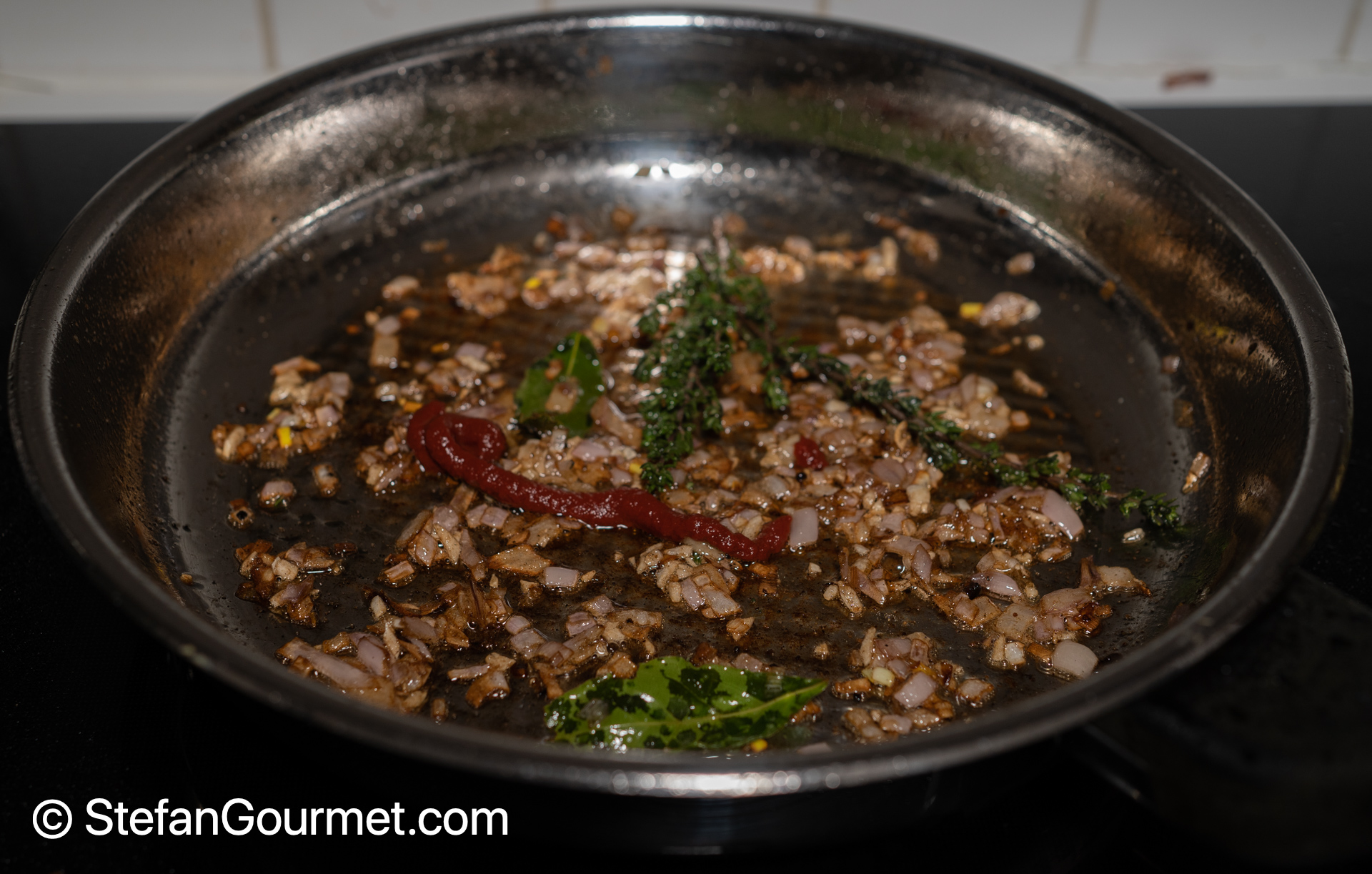 Add minced shallot, bay leaves, thyme, garlic, and tomato paste, and sauté until lightly golden. Do not allow the garlic to turn brown.