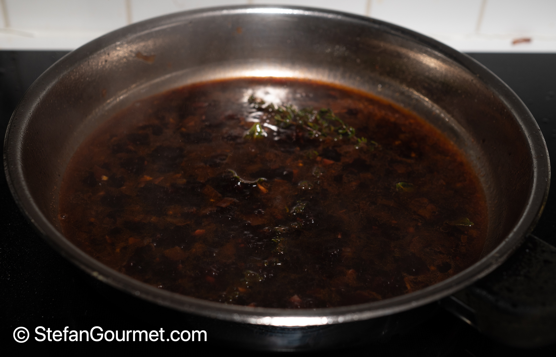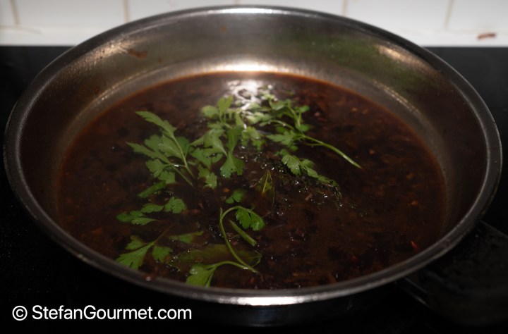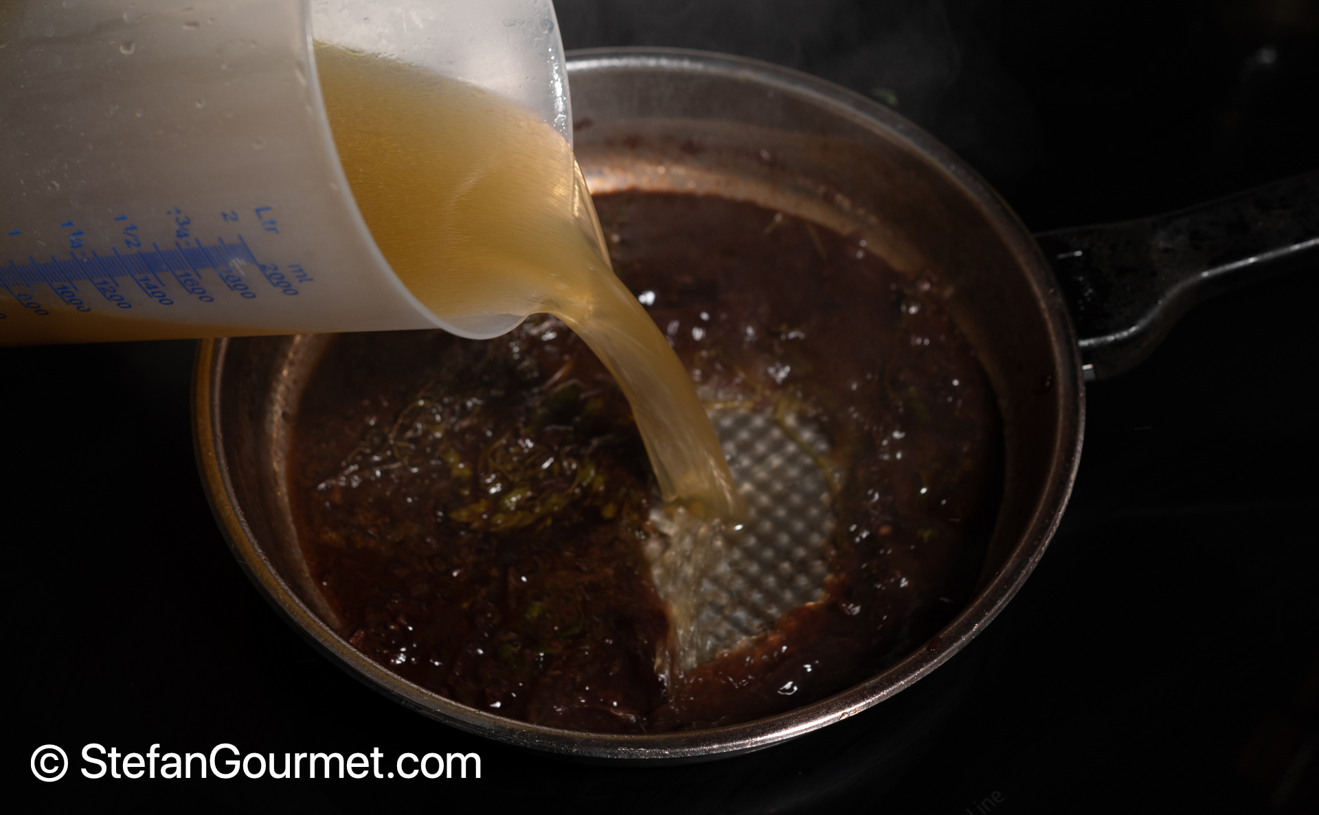 Return the sifted sauce to the pan, and simmer until reduced again by about half. Clean the surface now and then with a skimmer.