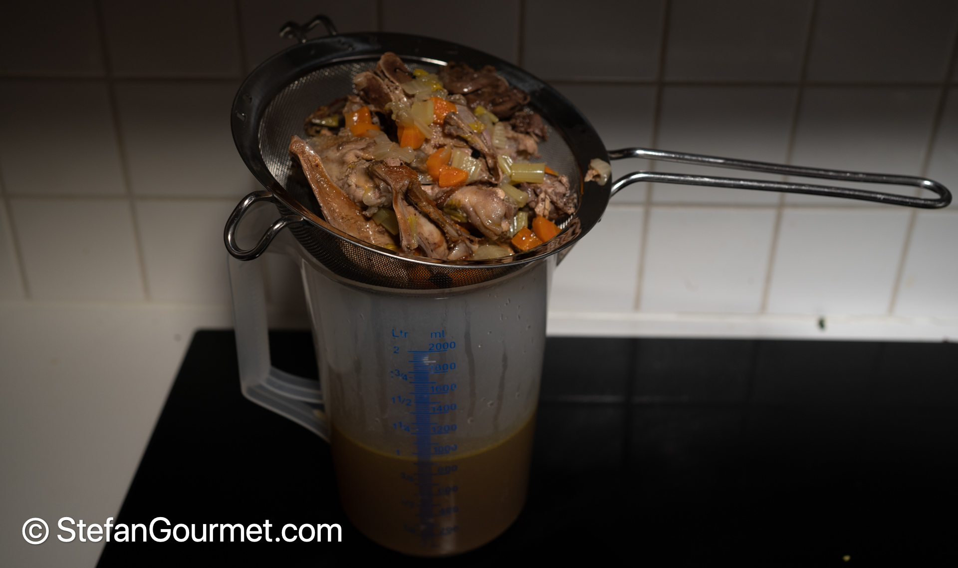 Sieve the stock and discard the solids. As you can see, these roosters were quite lean, as there is not a lot of fat floating on top of the stock. You can use that fat instead of oil for even more chicken flavor in the dish.