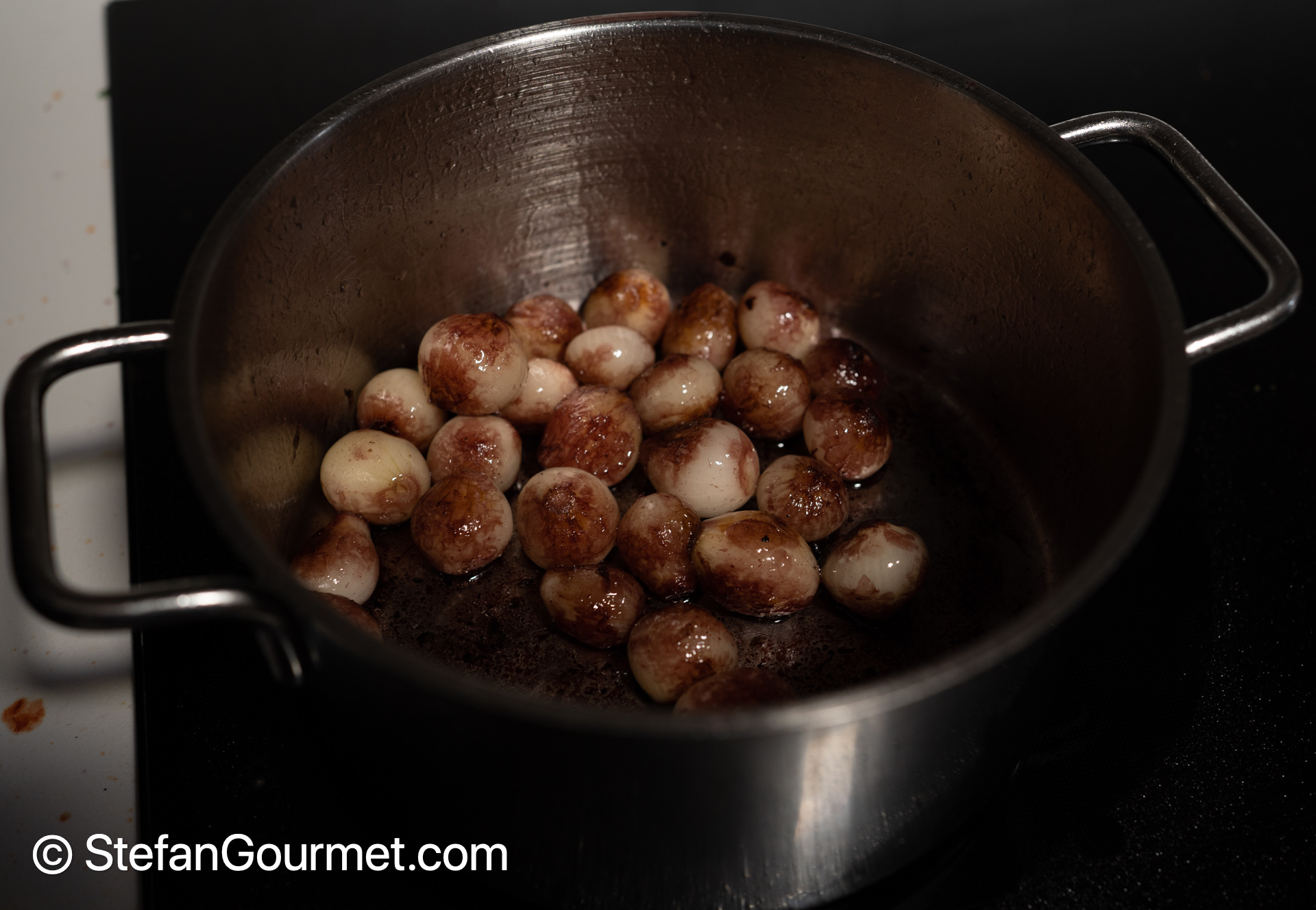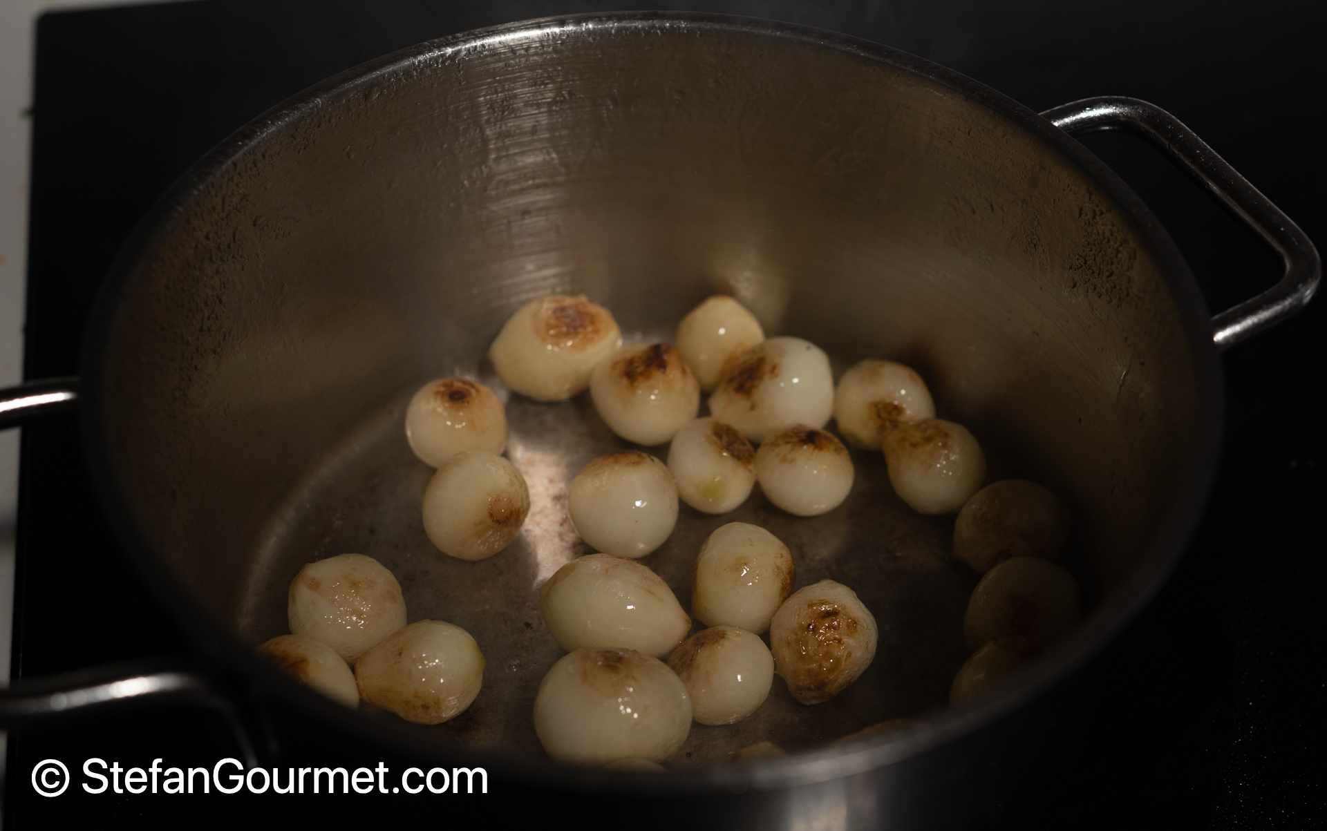 Peel the pearl onions by parboiling them for 1 minute, then chill them in cold water, and finally peel them. Heat clarified butter or olive oil in a saucepan and cook the pearl onions over medium-high heat until they are browned, turning them often.