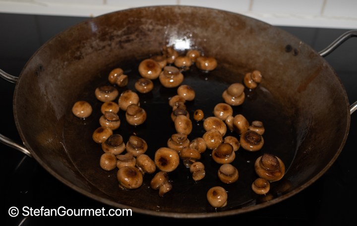 Sauté the baby mushrooms in clarified butter or olive oil until they are cooked and nicely browned. Do not crowd the pan, as otherwise they won’t brown. Season them with salt only after you’ve finished sautéing them.