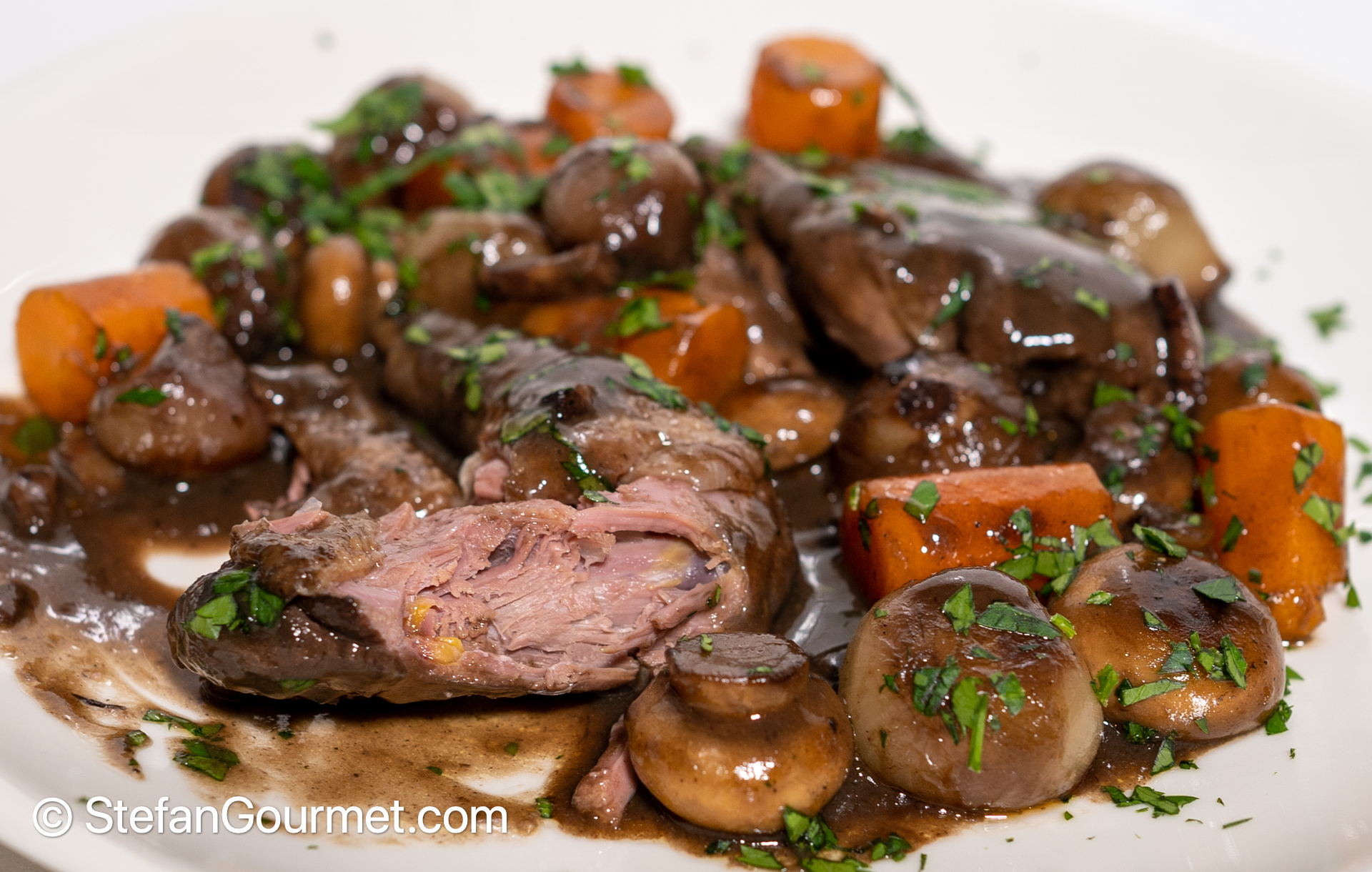 Serve on preheated plates. I served freshly baked bread on the side, but mashed potatoes would also be excellent.
