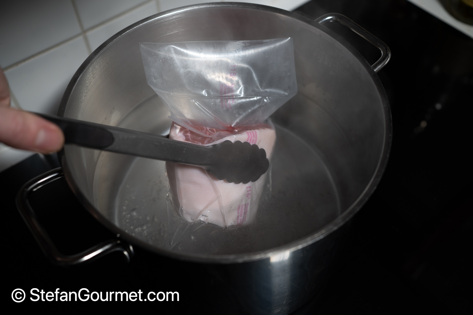 Heat a pot of water to at least 77C/170F (boiling also works). Dip the vacuum sealed meat in the hot water for 10-20 seconds…