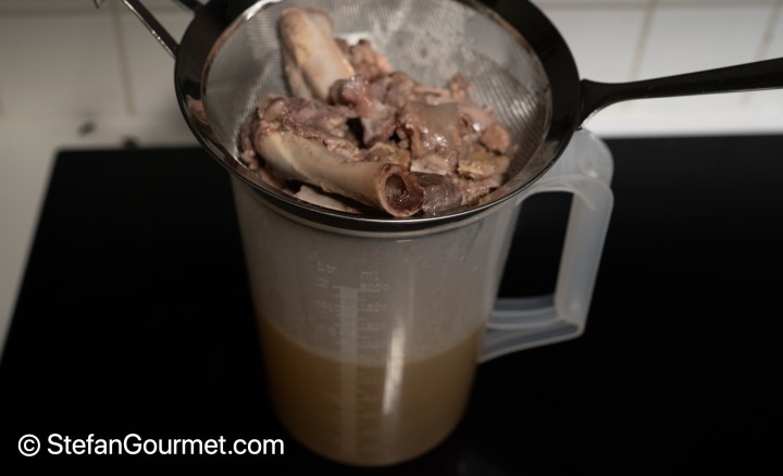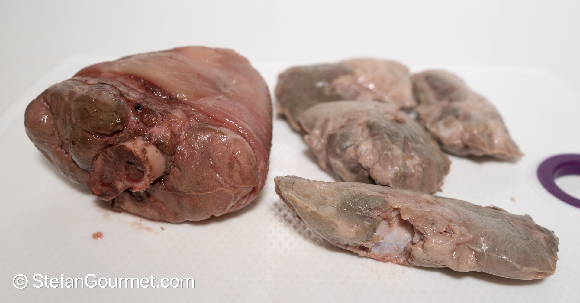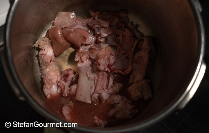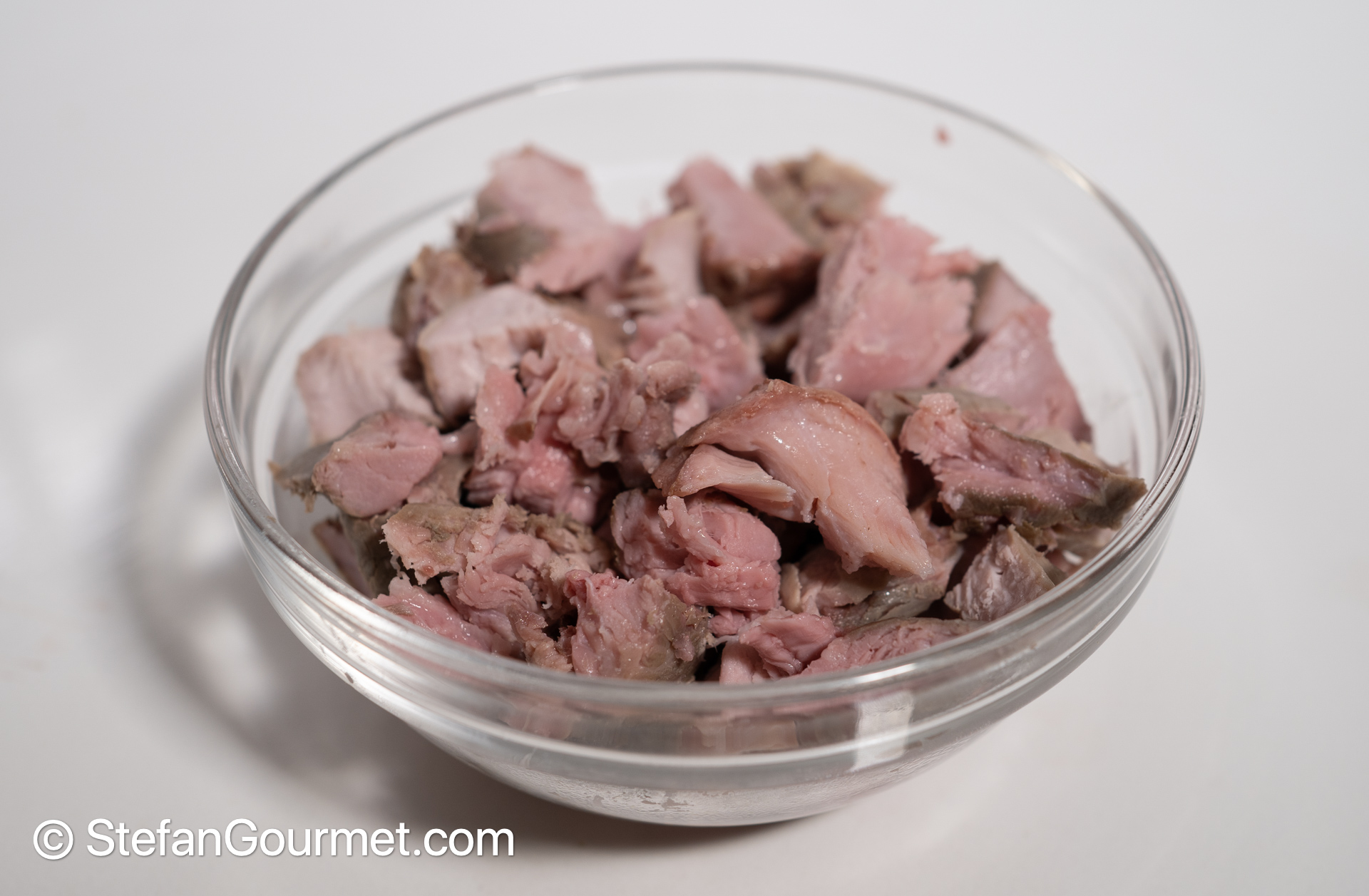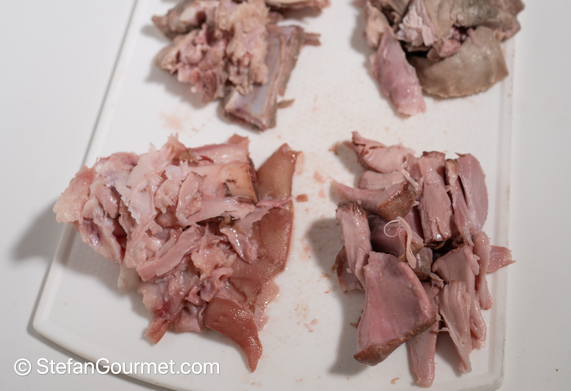 Separate into nice meat (on the right-hand side on the photo), and skin, bones, and other bits (on the left-hand side on the photo).