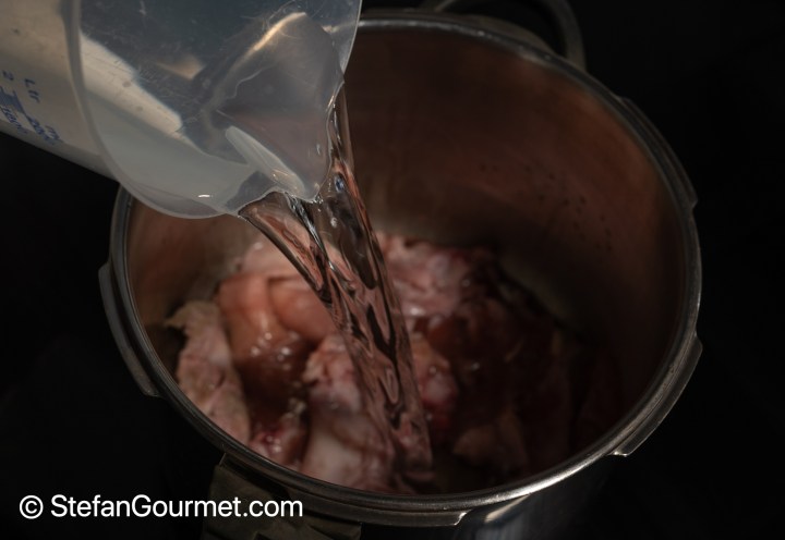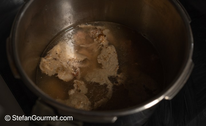 Put the skin, bones, and other bits in the stock pot or pressure cooker with the sous vide juices.
