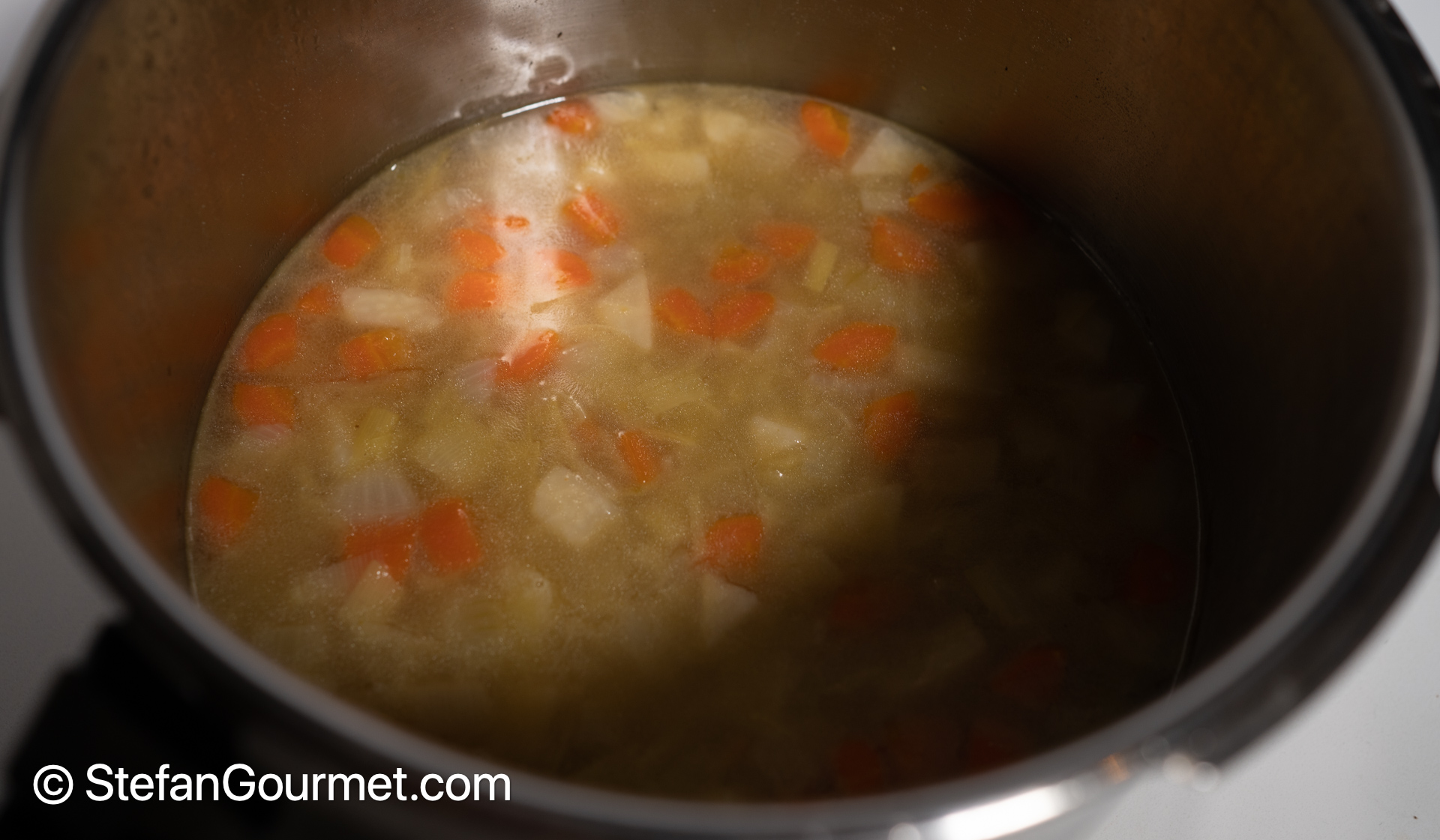 Season with salt and freshly ground black pepper. Add the carrot, onion, leeks, potatoes, and celeriac, and continue to boil for another 30 minutes, stirring regularly.