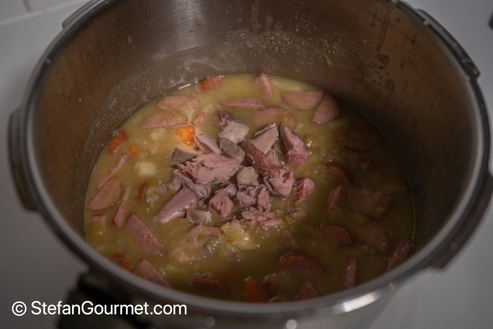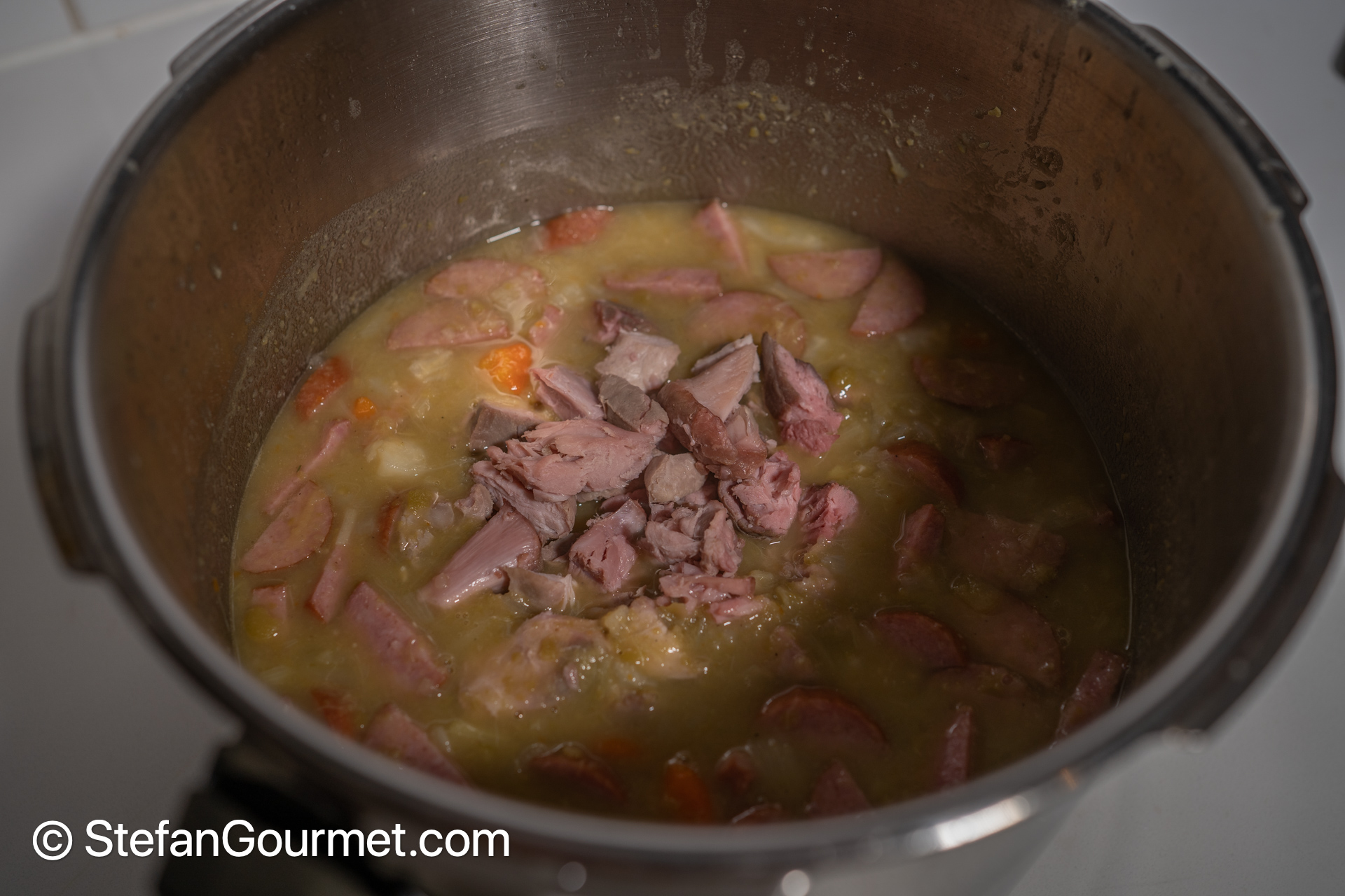 The verdict? Classically prepared erwtensoup has uninteresting bits of dried out tasteless pork in it. The pork has given up all of its flavor into the stock and it is only included for the nutritional value of the protein. The sous vide meat is much more succulent and flavorful. The amount of meat is not that great, and there is also a lot of smoked pork sausage, so in the grand scheme of the soup as a whole I am not sure if it is worth the extra effort and time. However, if you were to increase the amount of pork and perhaps even use it to replace the smoked pork sausage (by smoking the ham hock instead, before cooking it sous vide as shown in this post), it could certainly be worth it. This could certainly be a solution if smoked pork sausage is not available in your area. The smoky juices from cooking the ham hock sous vide would give the whole soup a wonderful smoky character.