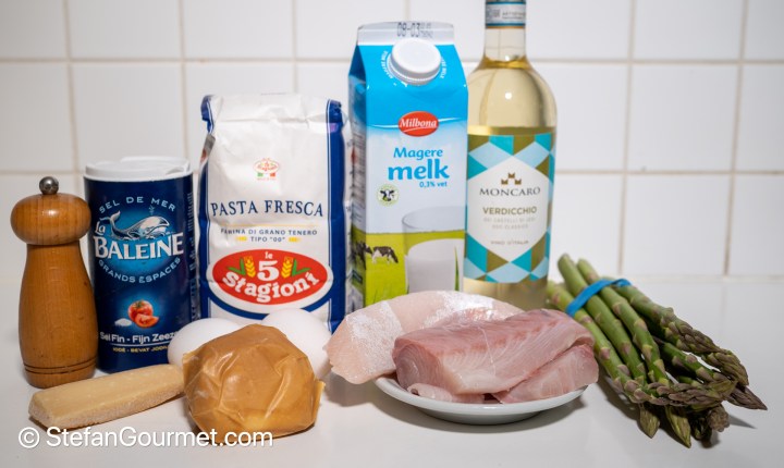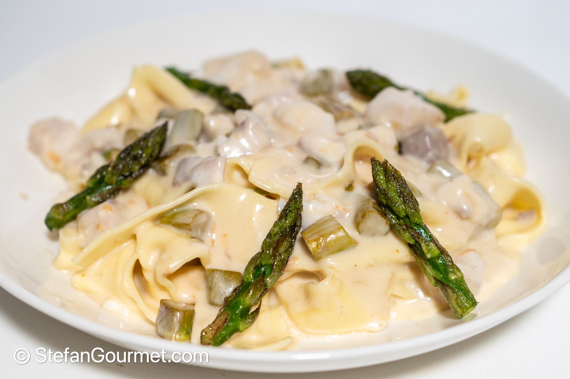 Then I thought of the secondo piatto shown above that I’ve already made several times and is very good. It can also be made with green asparagus instead of zucchini, but I decided that I wanted to make a primo piatto instead. I also had some eggs in my fridge, and although they didn’t need to be used up, I decided to make fresh pappardelle. They were dressed with a smoked cheese sauce, in which I gently poached the fish. I sautéed the asparagus in butter and served everything together. Although I suppose pasta svuotafrigo is usually not as elaborate or fancy as this, it turned out excellent, and next time I will buy the ingredients on purpose to make this again. Fish and cheese are not often combined in Italian cooking (and is sometimes even referred to as heresy), but in this case it works very well, as the kingfish has enough flavor to stand up to the cheese sauce. And I did get the inspiration for the combination of this fish with a scamorza sauce from a Michelin starred restaurant near Naples.