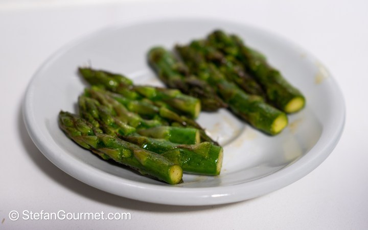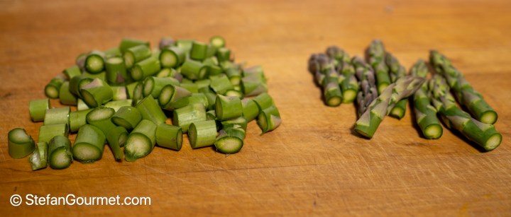 Take the tips out of the pan and reserve. I put them in the oven together with the plates at 100C/220F to keep the asparagus warm en preheat the plates.