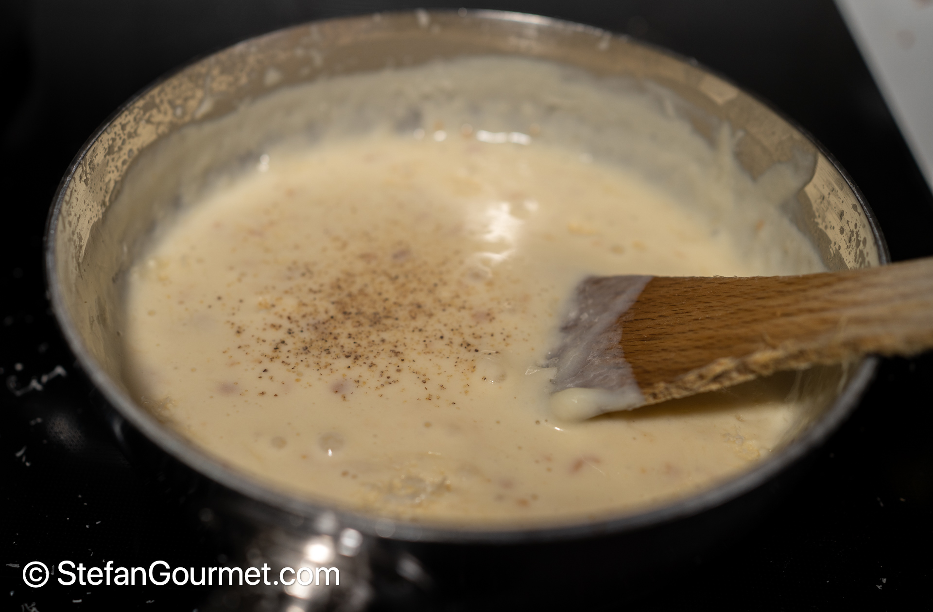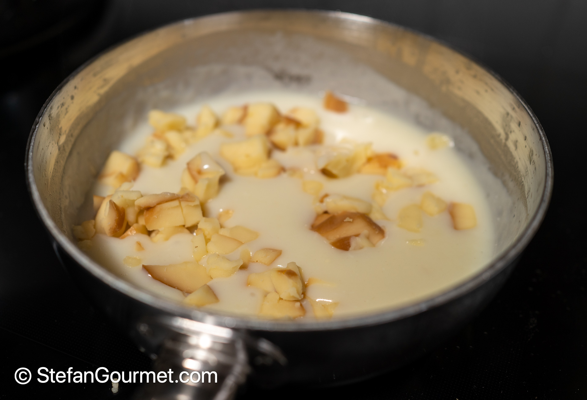 …add the diced scamorza, and allow the cheese to melt, stirring over low heat.