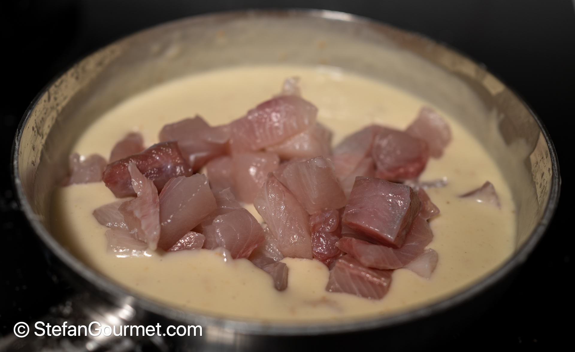 Dice the fish, season with salt, and refrigerate. This will also the salt to penetrate the fish while you prepare the rest.