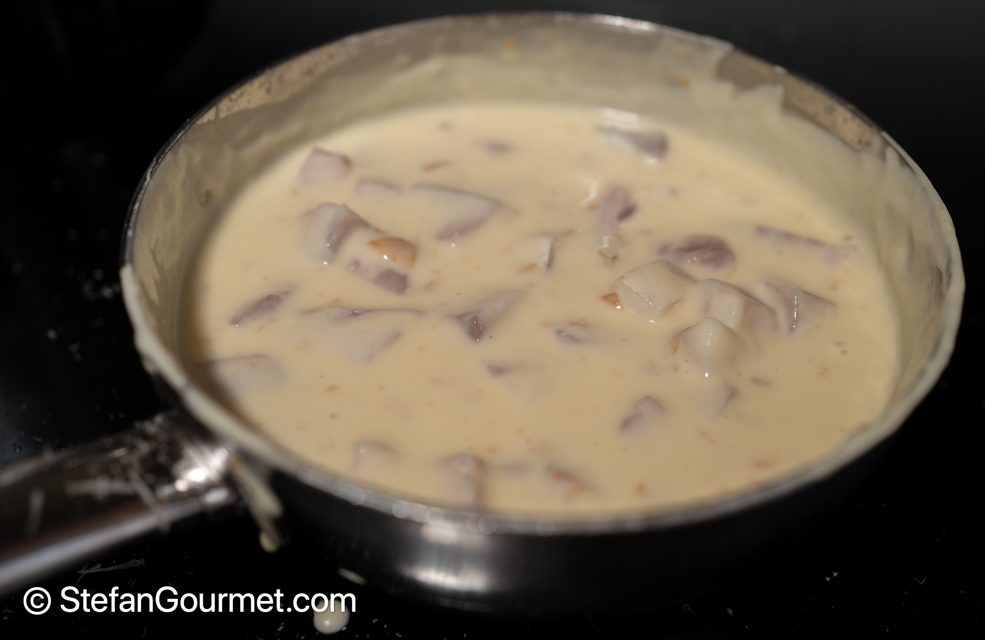 If I remember well I used boeren (farmers?) Brie, a little leftover Gorgonzola and the Parmigiano. Added a few drops of Valderama smoked oil, to simulate your Scamorza. Cooking the fish in the bechamel was great! I think I had Skrei or Merluzza. I guess we had stir fried spinach with garlic. Sure to make it again sometimes!