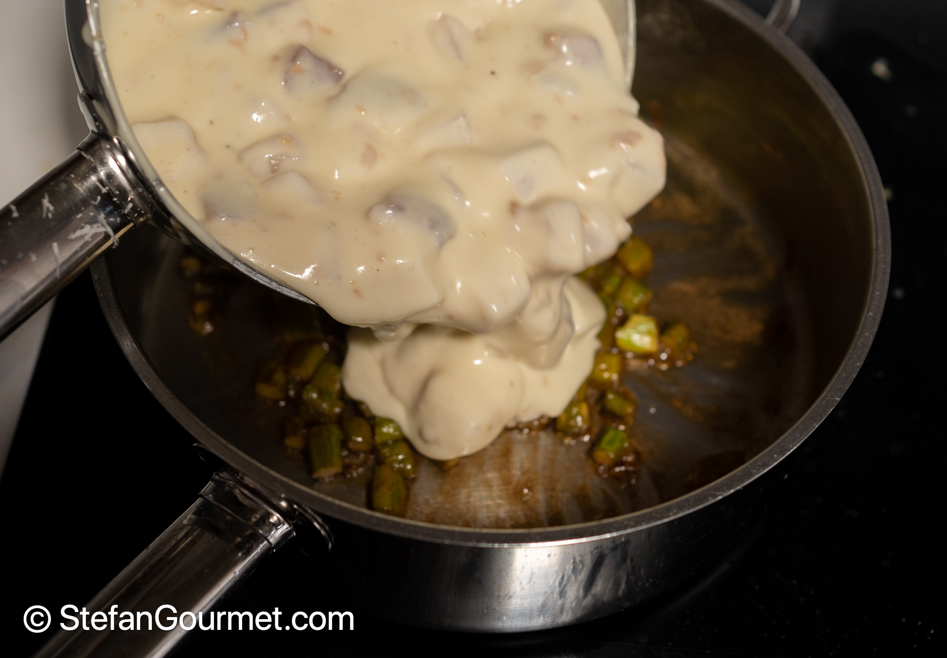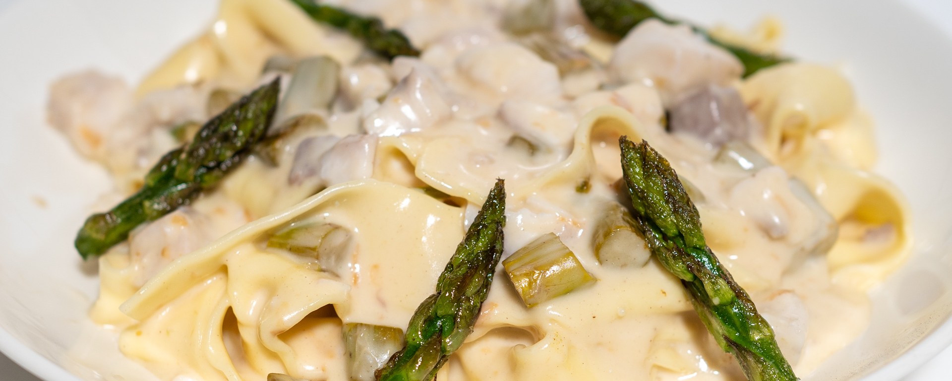 When the pasta is almost cooked, add the fish and cheese sauce to the asparagus over very low heat.