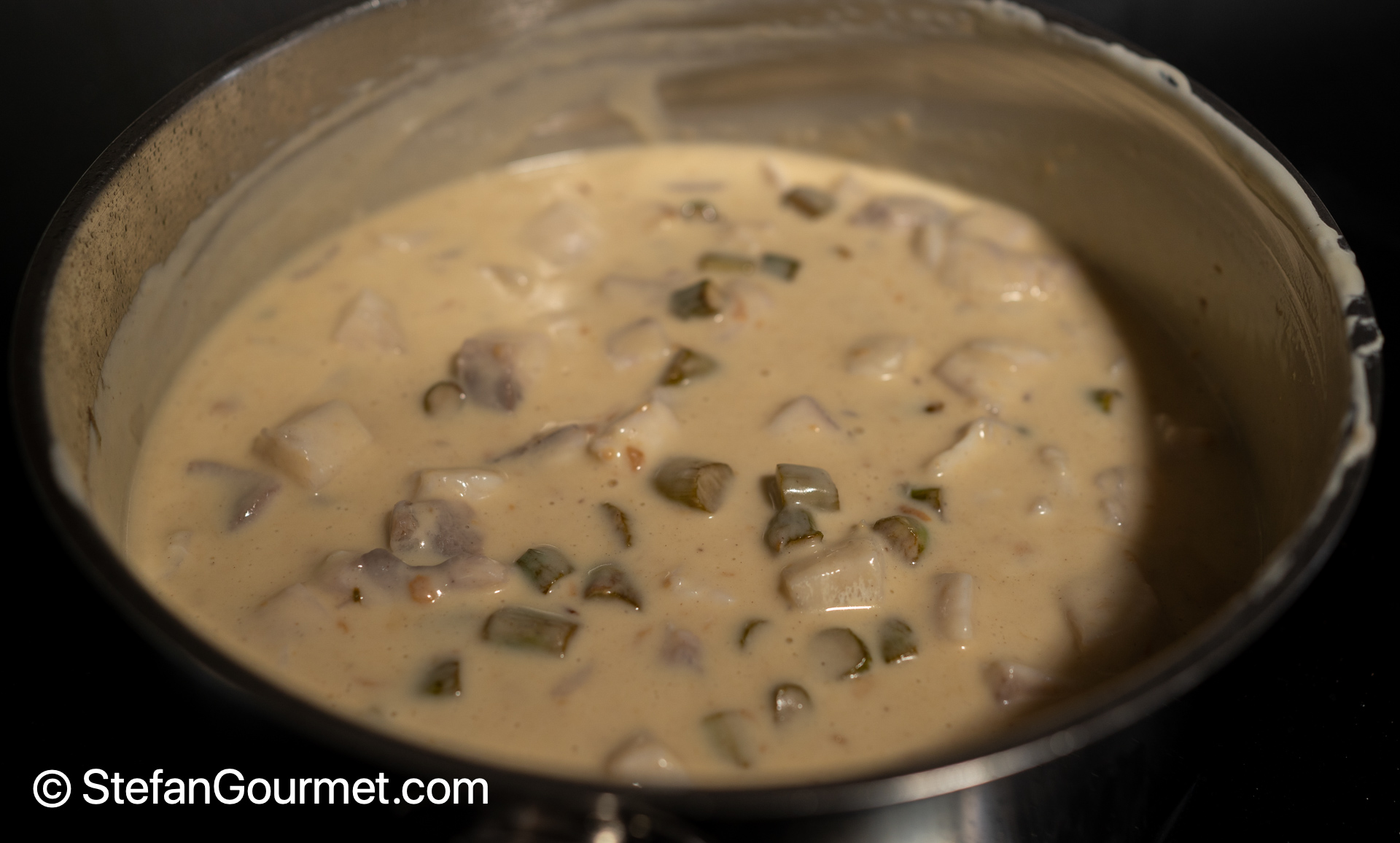 Stir, then turn off the heat. The residual heat of the sauce will very gently cook the fish without drying it out. This takes only five minutes.