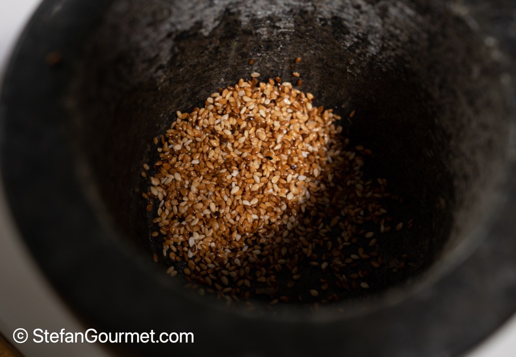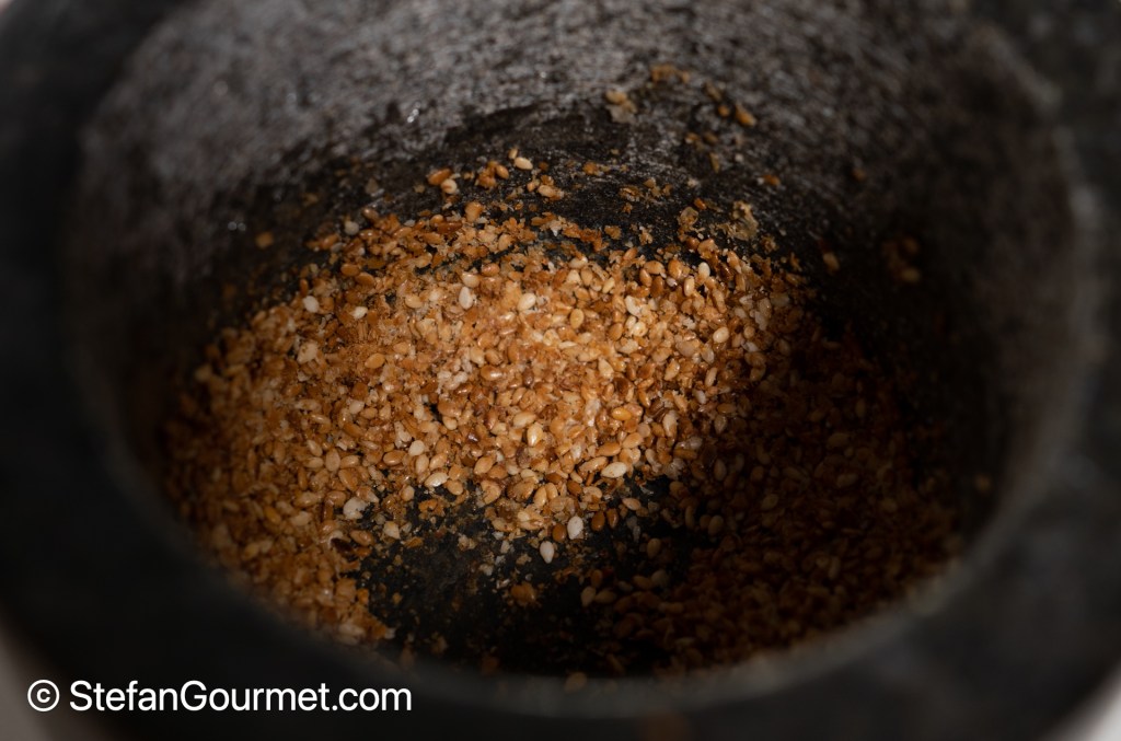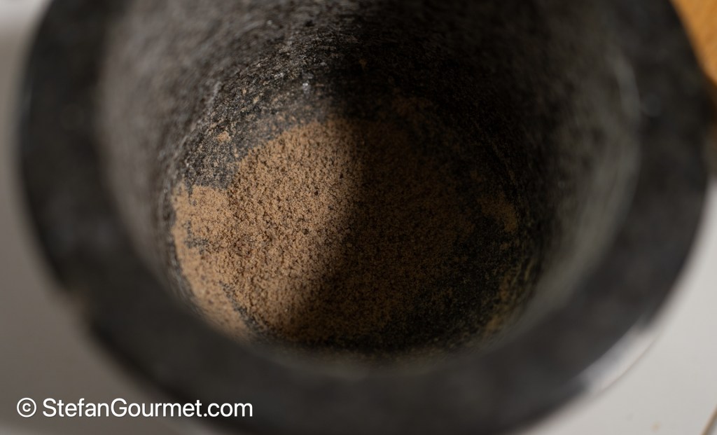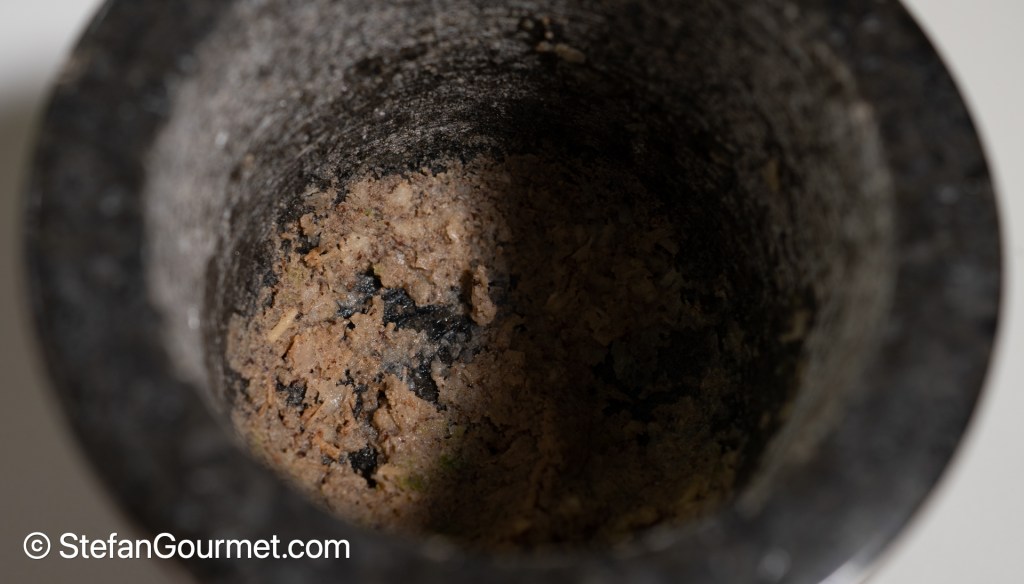…and pound until mashed. Remove this paste from the mortar and set aside. Do not clean the mortar.