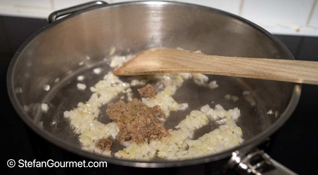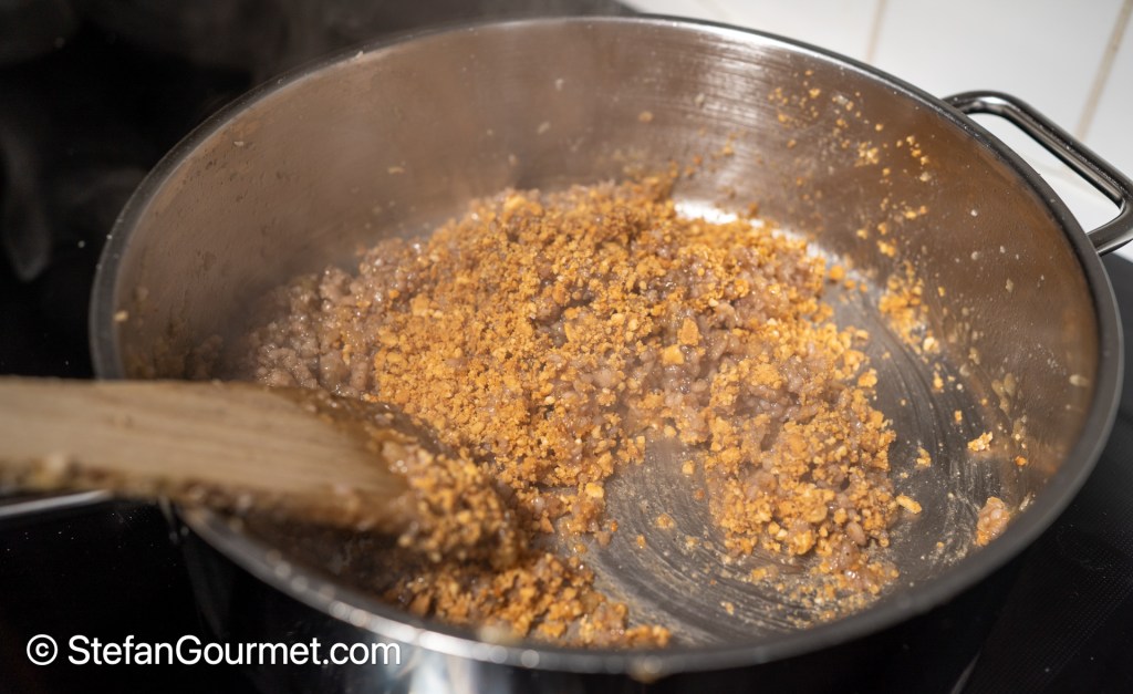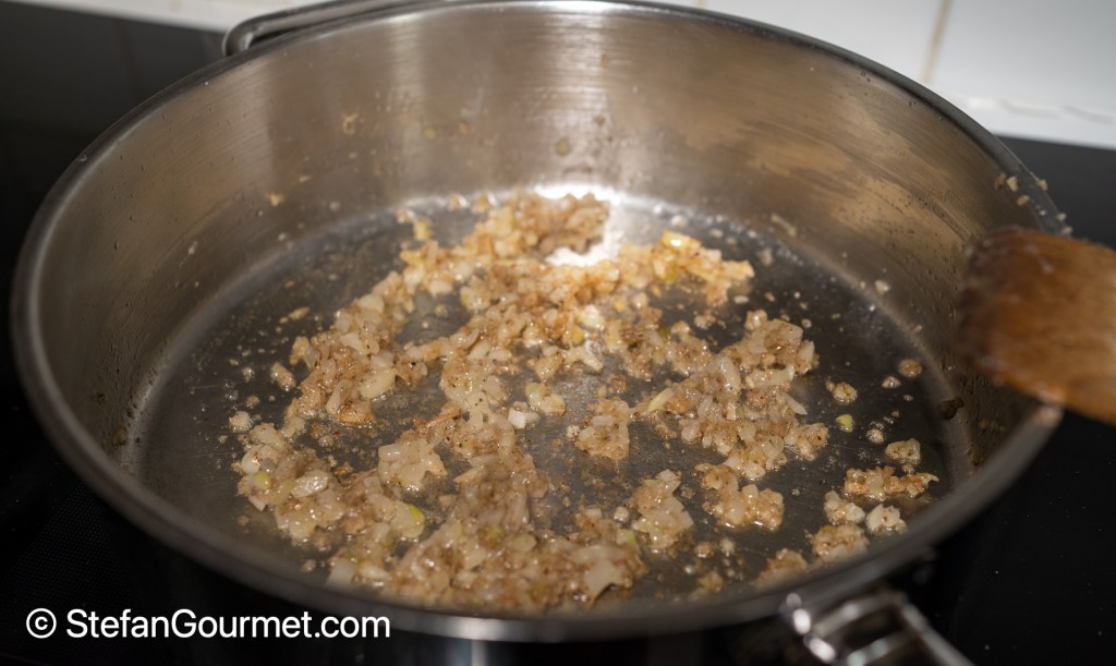 Heat 2 tablespoons of oil in a frying pan (you can also use a wok because that makes it look more Thai, but it won’t affect the taste) and add the minced onion.