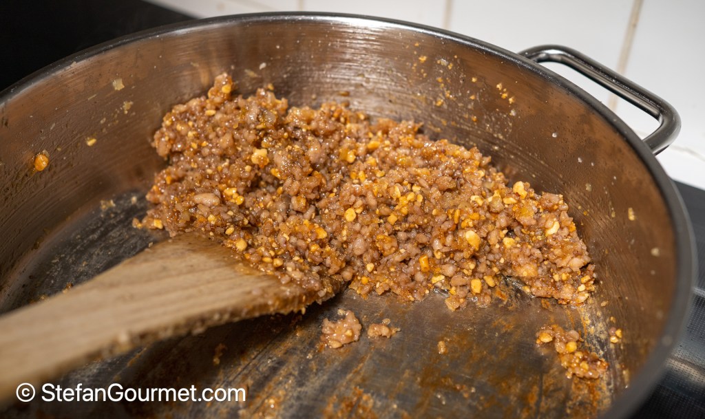 …and keep stirring over medium heat until the filling is sufficiently dry. Then allow the filling to cool completely and chill it in the refrigerator. This will make it easier to work with.