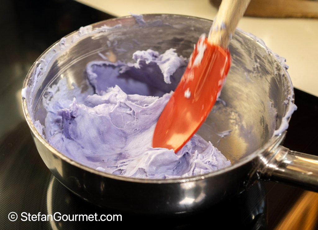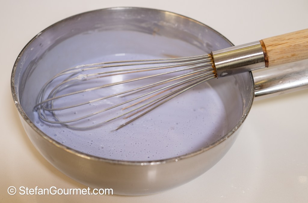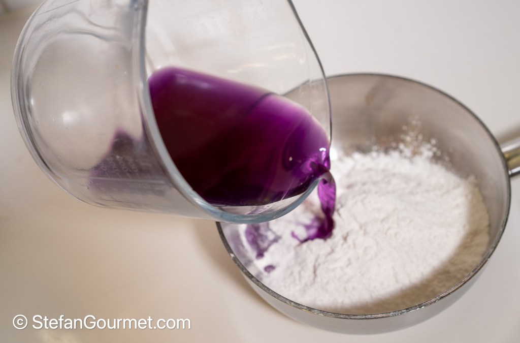 Put the flours in a saucepan, and add the purple water as well as the coconut milk.