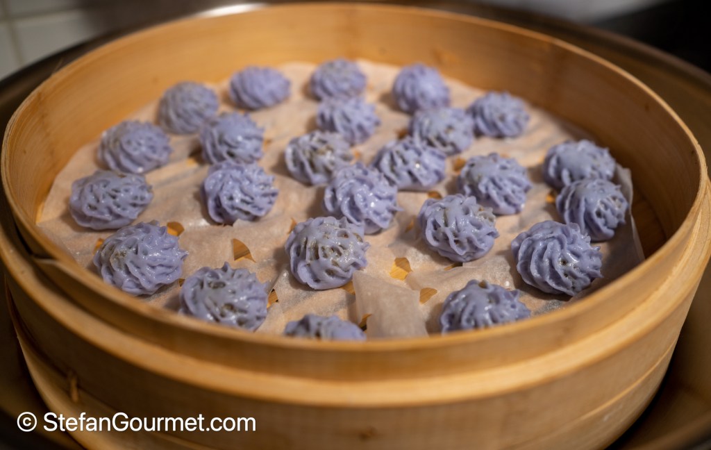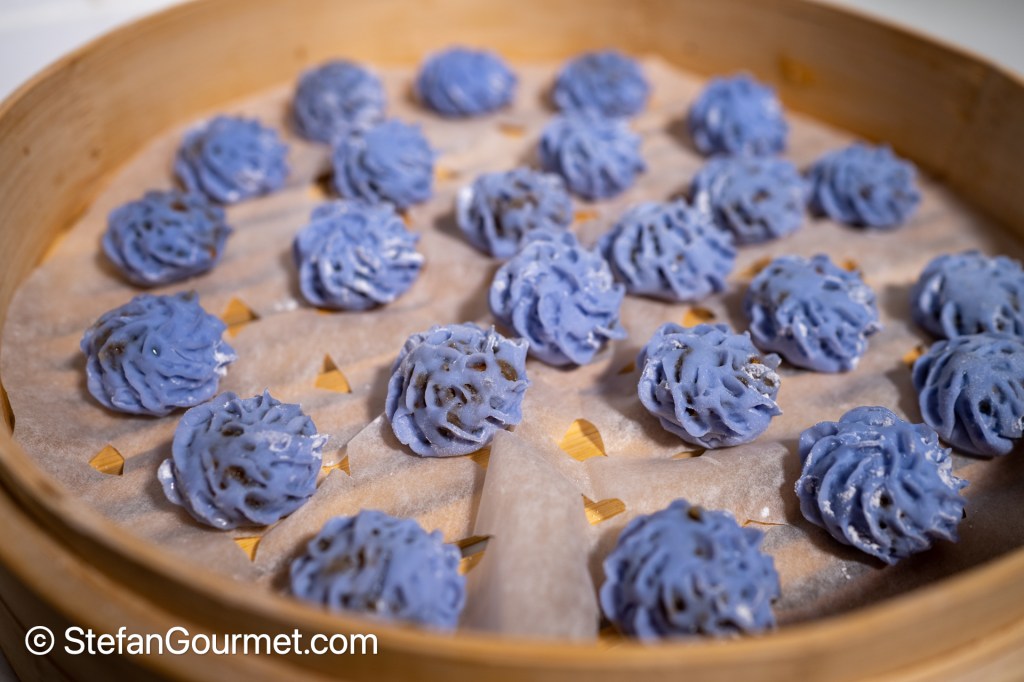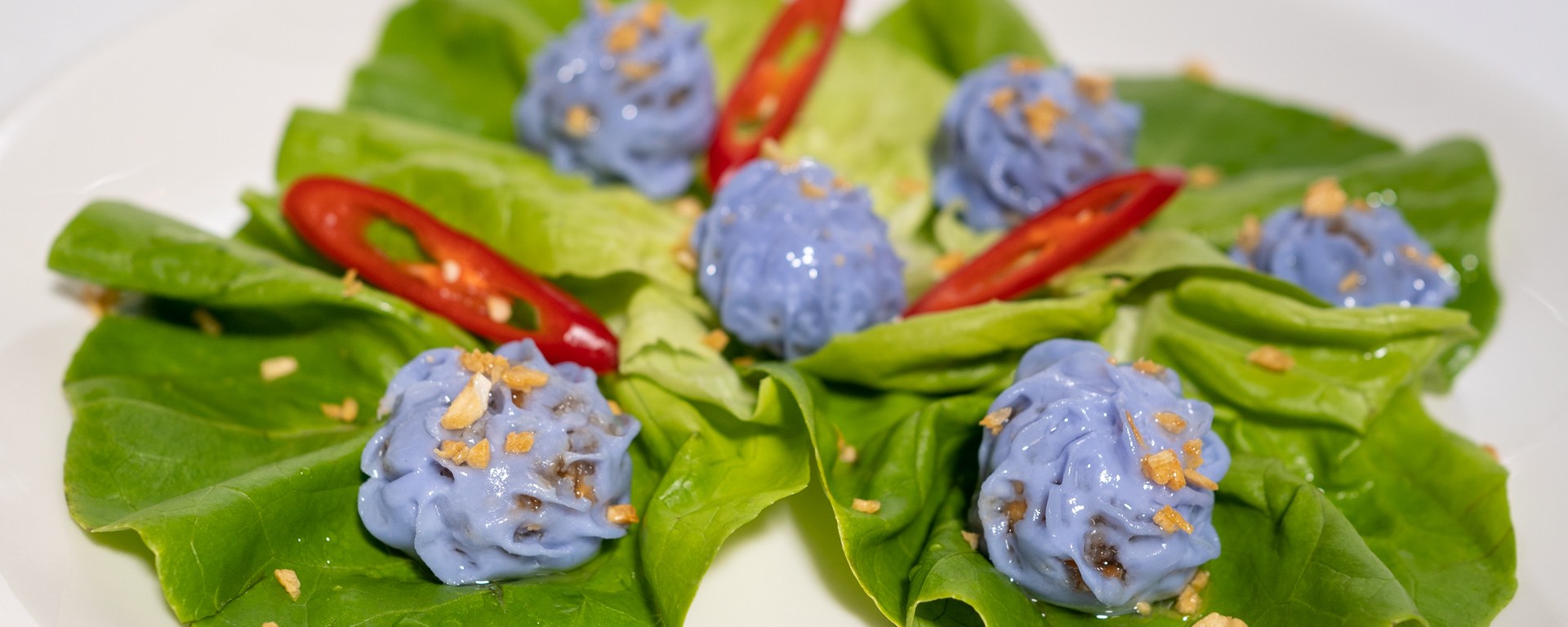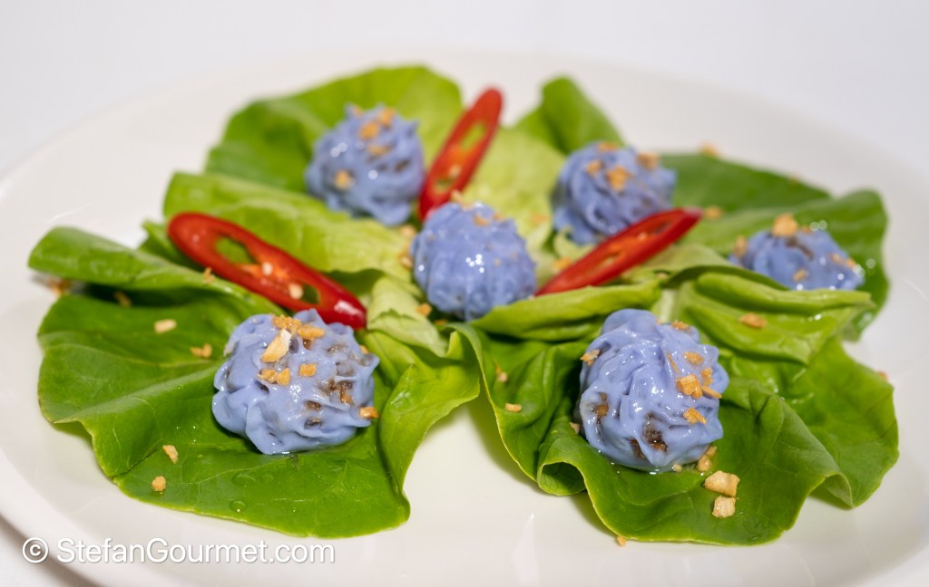 Chor Muang is called “royal” for a reason, because only royalty has the kind of kitchen staff that is needed to put this much effort in presentation of food alone. The name literally means “purple bouquet”. Chor Muang are dumplings of rice flour colored with butterfly pea flowers and filled with a sweet-salty filling. They are tasty, but they are a LOT of work.