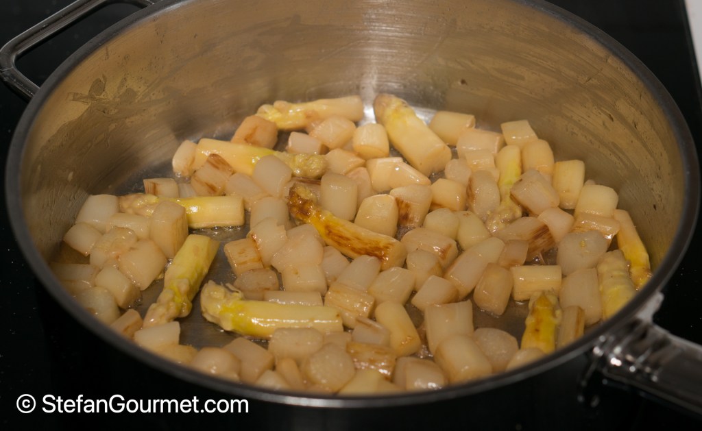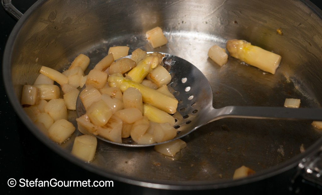 Take the asparagus out of the pan and reserve. Do not clean the pan.