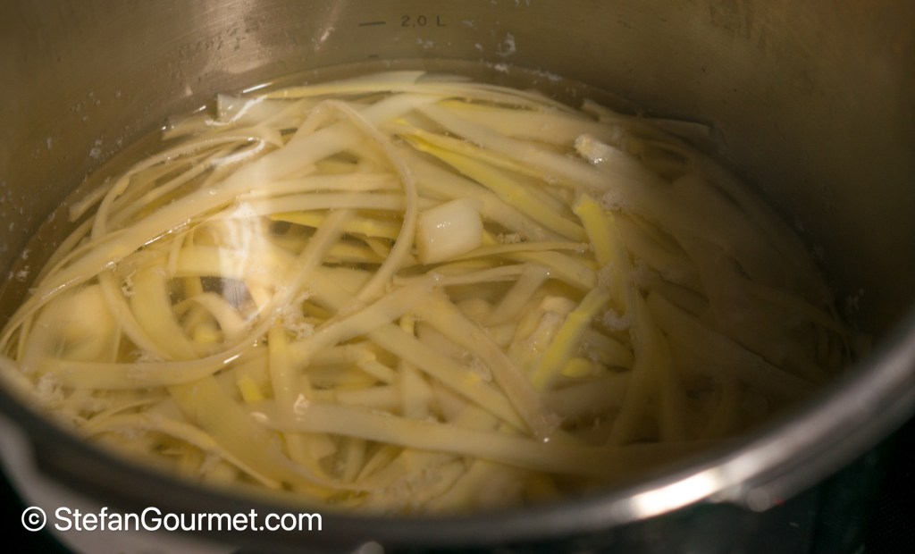 Put the peels and bottoms in a pot with 1 litre (4 cups) of water. Cover, bring to a boil, and simmer for half an hour. Use a pressure cooker for better flavor extraction.