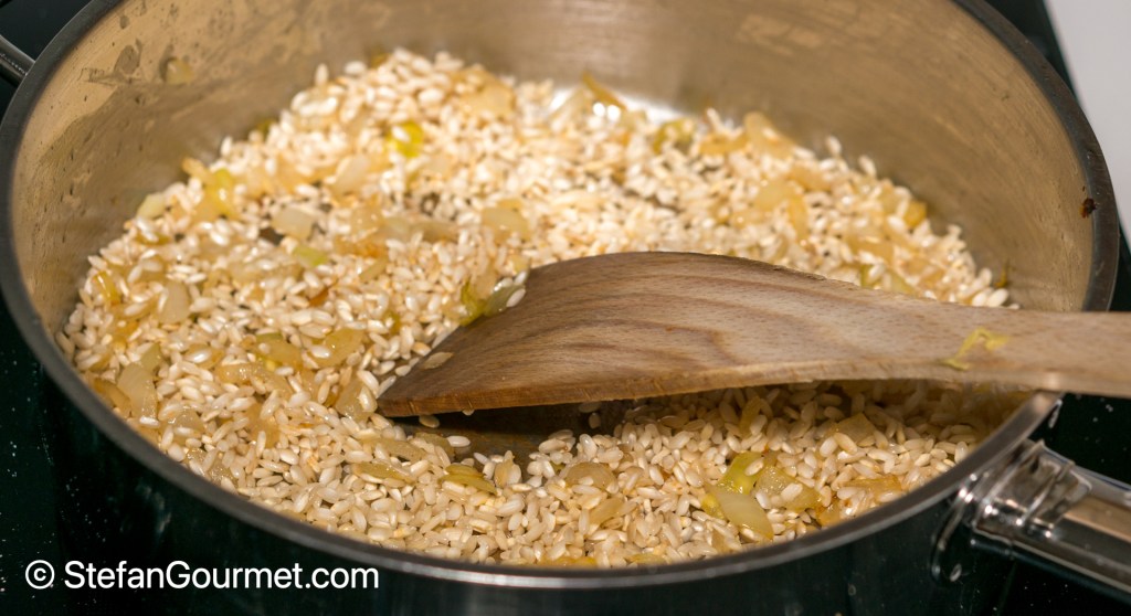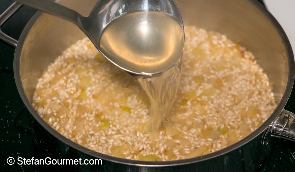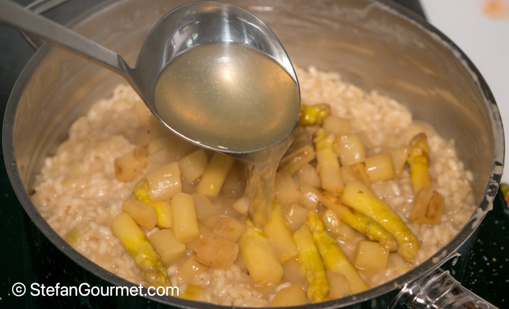 As soon as the stock has been absorbed, add more stock. Keep adding stock and keep stirring until the rice is al dente, about 16 minutes.