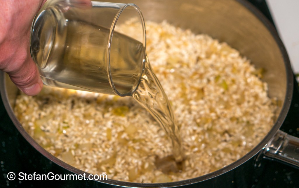 Deglaze with the white wine, and stir over medium heat until the wine has been absorbed.