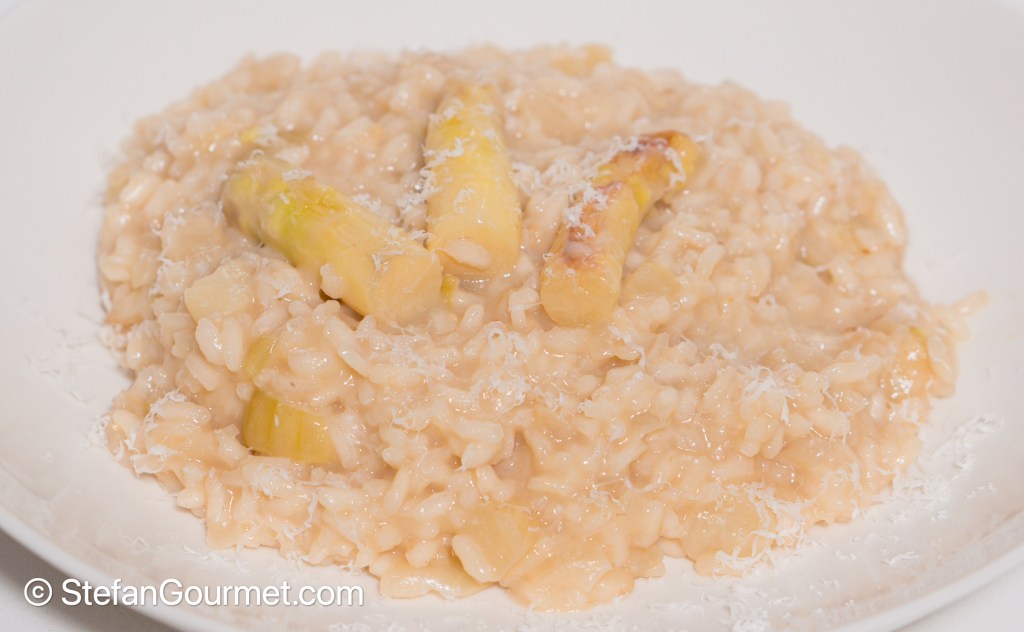 White asparagus are in season, and so it’s time to post a recipe that I cooked and photographed last year at the end of the asparagus season. White asparagus are the norm in Northern Europe. Although green asparagus are more common in Italy, there are also white asparagus in Italy. White asparagus are different from green in that you need to peel them and they have a more delicate flavor. Click here for the recipe for green asparagus risotto.
