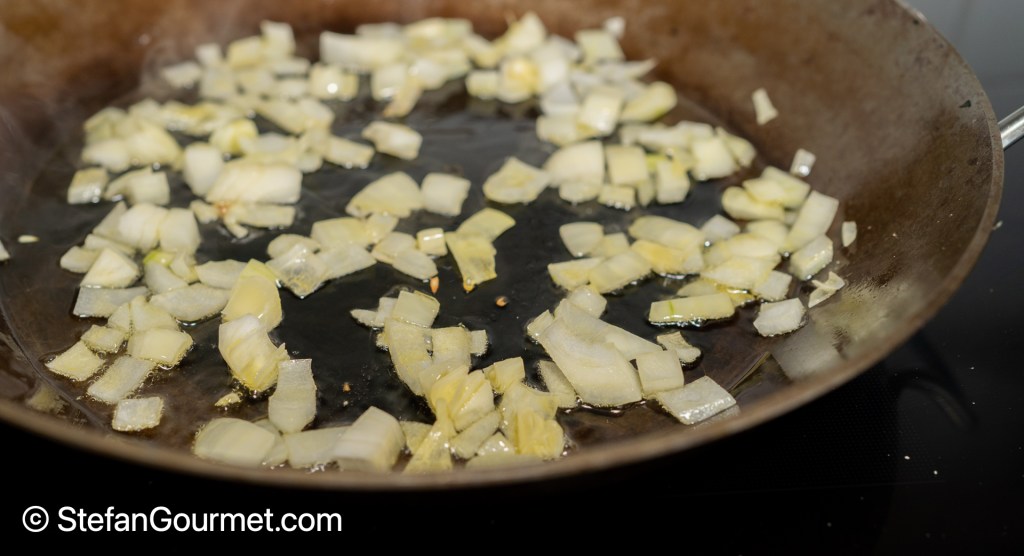 Heat 2 tablespoons olive oil in a frying pan. Add the chopped onions, and sauté until they are translucent.