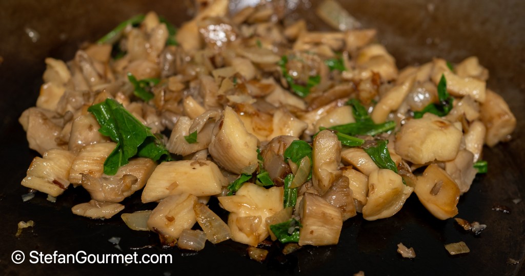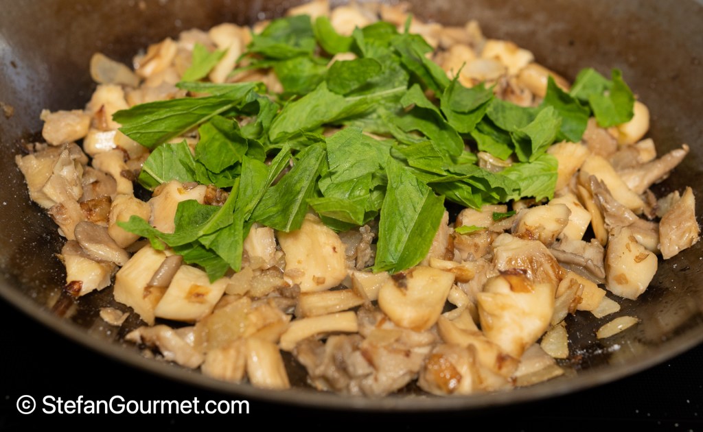 Add the mushrooms, and keep sauteing until the mushrooms are cooked but still have some bit.