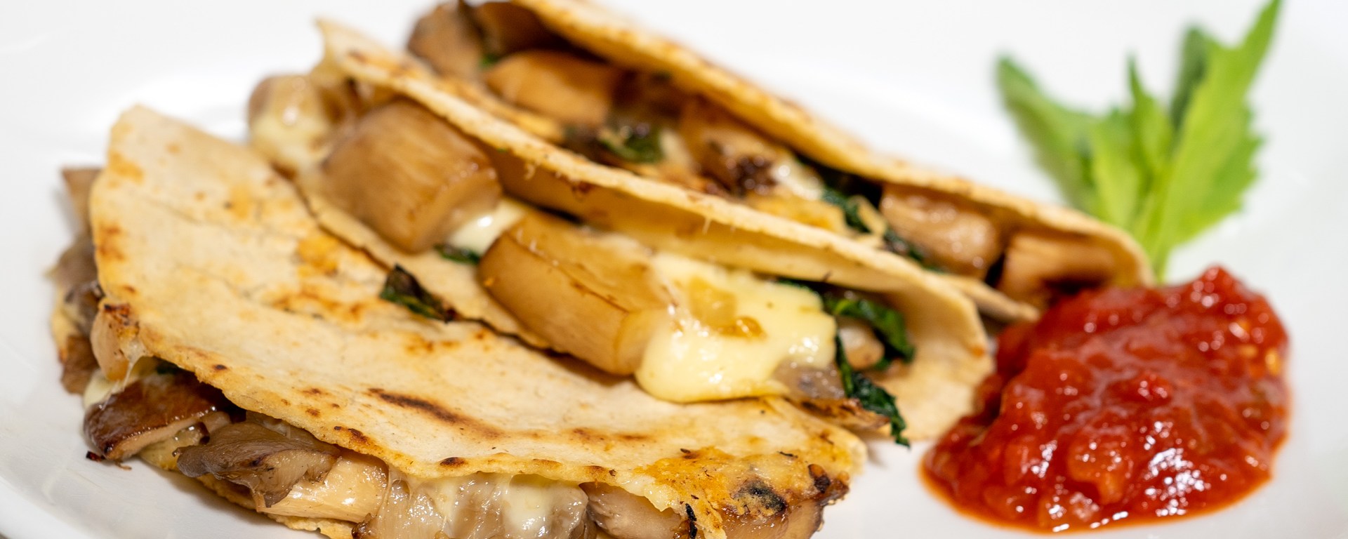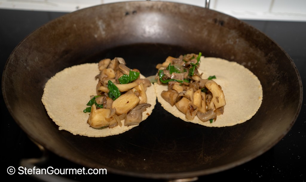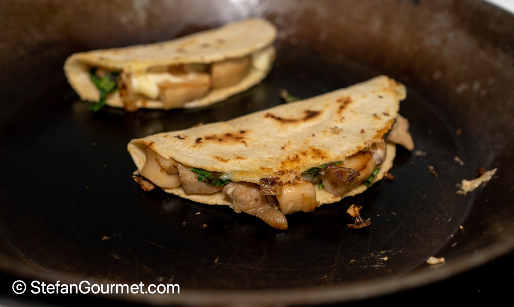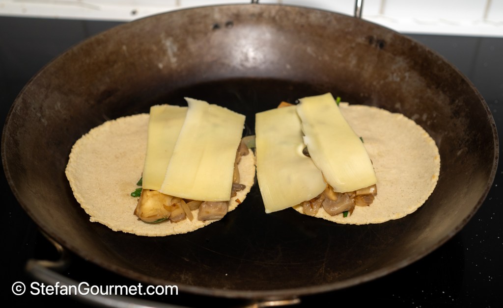 To make quesadillas, put corn tortillas in a dry pan (without oil) over medium heat. Place 1/8 of the mushroom filling on one half of each tortilla.