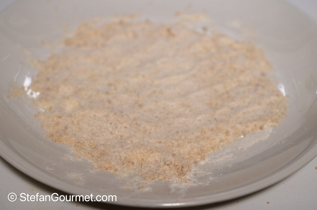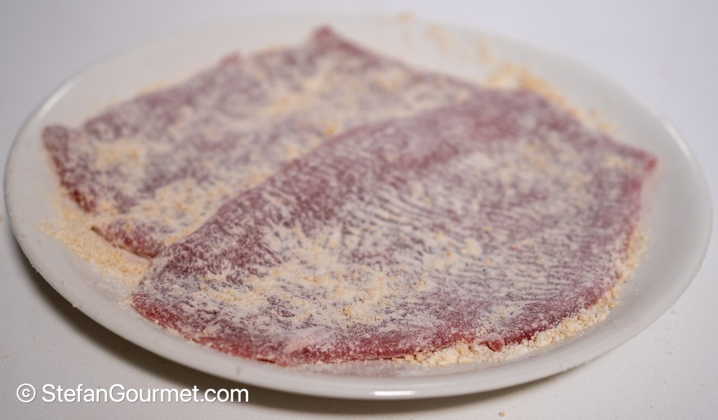 Coat the scaloppine on both sides with the hazelnut and flour mixture, pressing with your hands to make it stick as much as possible.