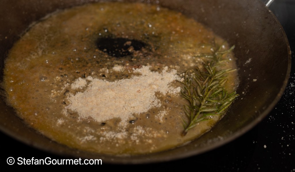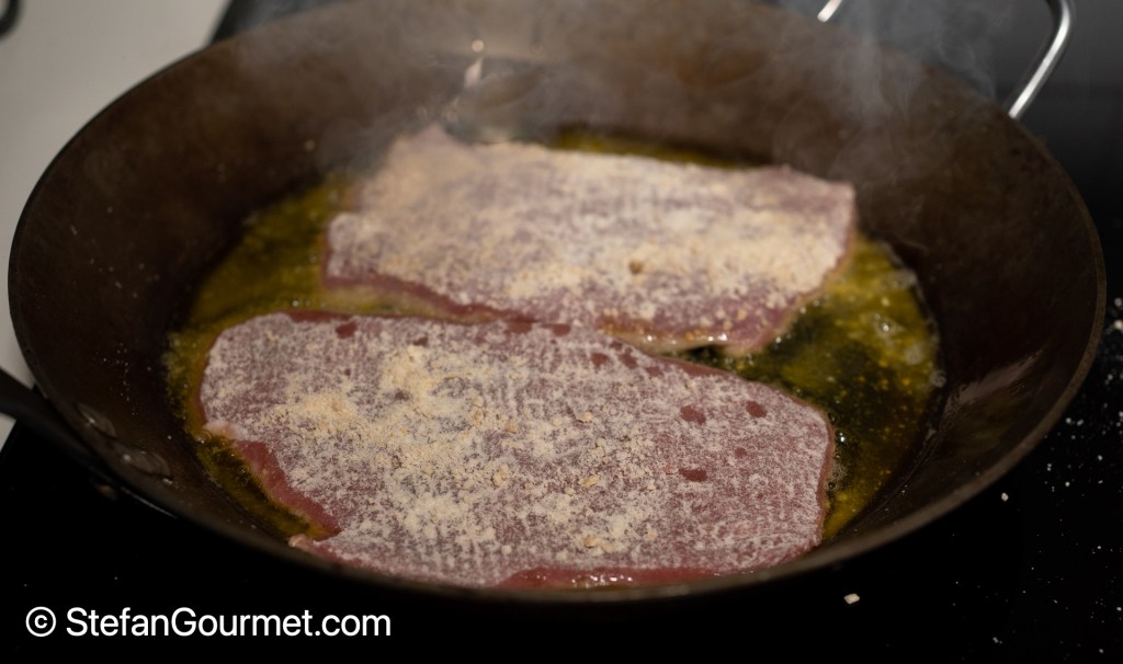 Fry the hazelnut-covered scaloppine in the rosemary-infused olive oil over high heat…